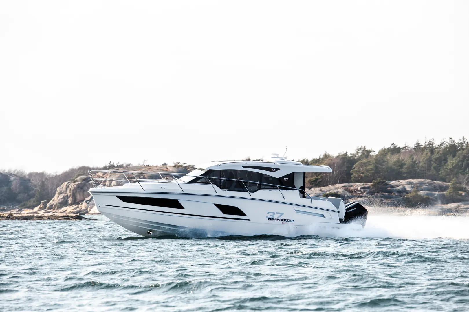 Grandezza 30 Outboard er 9,35 meter lang og har plass til ti personer og to lugarer med totalt fire køyeplasser. Denne utstyres med to Mercury Verado V8 på 250 hk.