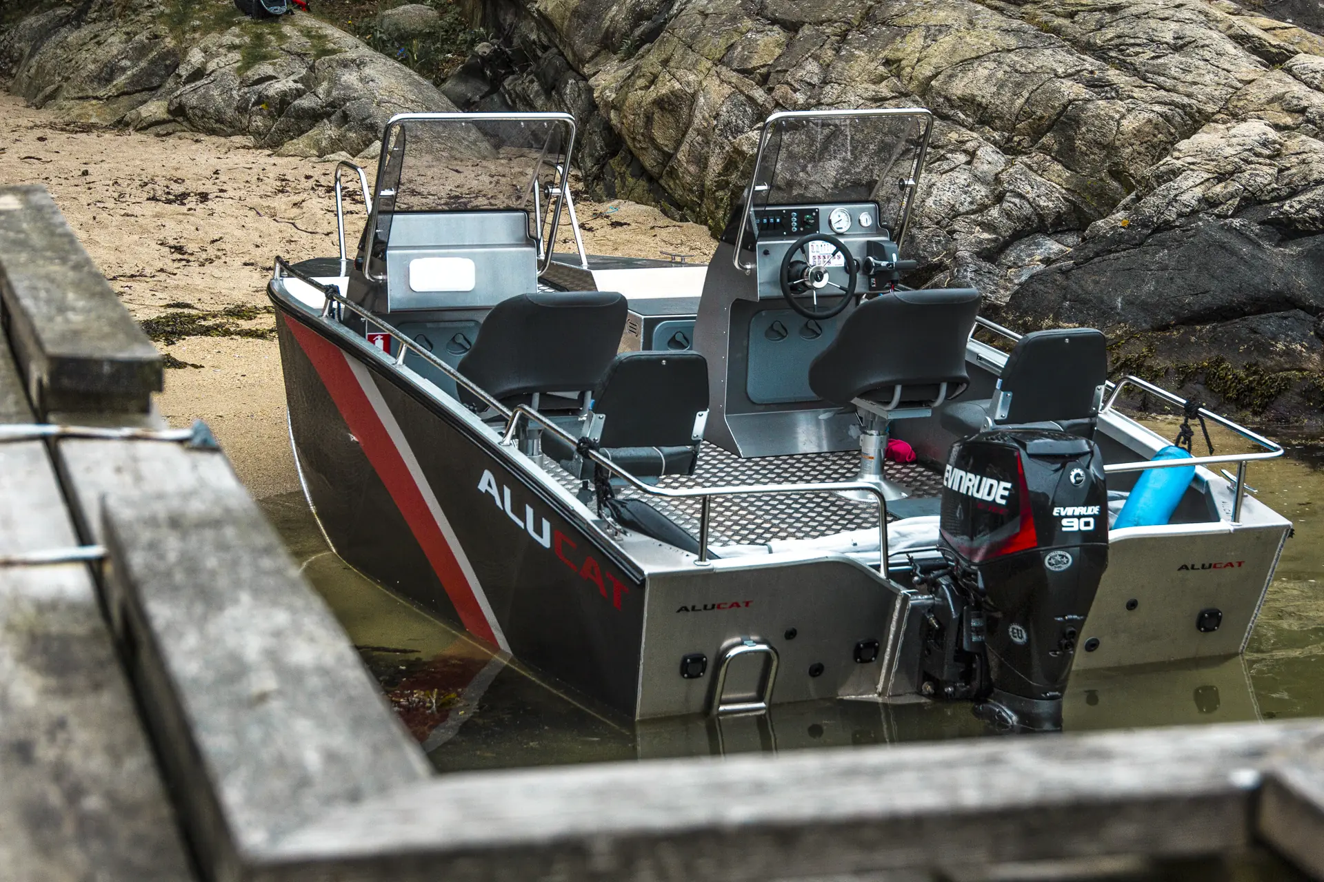 Katamaranskroget gir også en lite markert planingsterskel, og retningsstabiliteten virker bra til å være singel motor med to skrog. Fordelen er helt klart en god stabilitet, og dertil et skrog som ikke legger seg over i sving. Anbefalt motor er 50 – 100 hk., og på vår testbåt sitter en 90-hester fra Evinrude. Med den måler vi en toppfart på 38 knop og marsfart på cirka 35 knop.