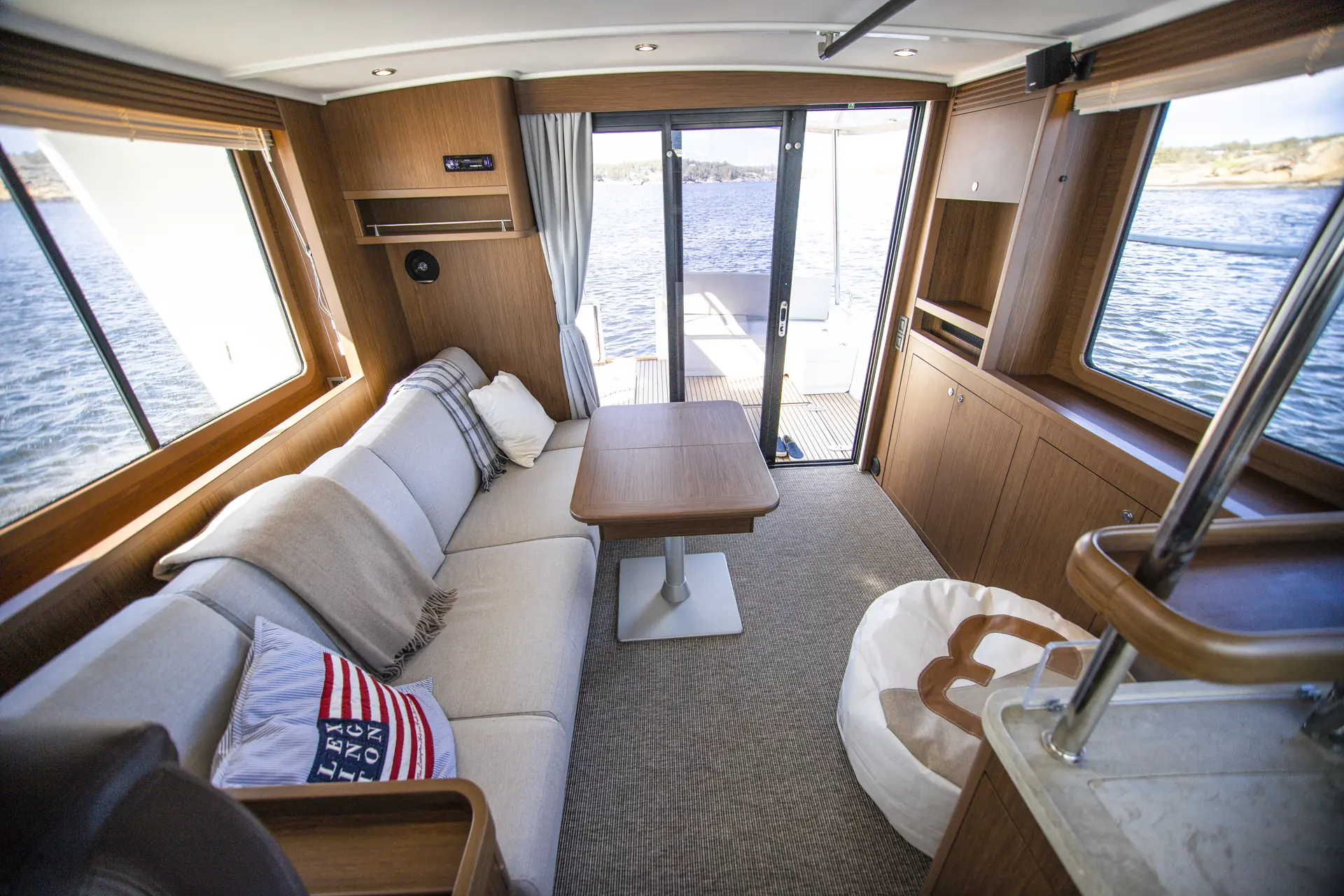 Salongen har en rett sofa med puff, et bord og skap og hyller på babord side for TV og oppbevaring. En bredde på 4,25 meter og brede dollbord på hver side gir naturligvis noen kompromisser innvendig, og for de som kunne tenke seg en U- eller L-sofa må kompensere med puffer – som fungerer bra. Fordelen er at sofaen enkelt kan slåes ut til en dobbeltseng – og med lystette gardiner blir salongen et soverom for to.