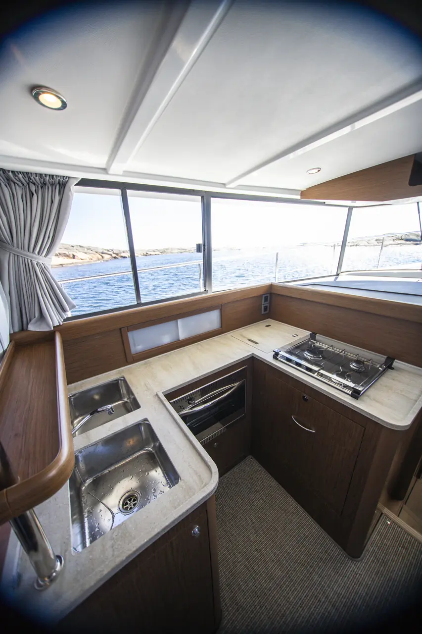 Den U-formede byssa på babord side er sosialt plassert med skyvevindu ut, har benker i god høyde og er på vårt testeksemplar rikelig utstyrt med to oppvaskkummer, ovn, tre gassbluss, eget rom for søppel, kjøleboks, kjøleskap og oppvaskmaskin. Sistnevnte stjeler naturligvis noe skuffeplass.