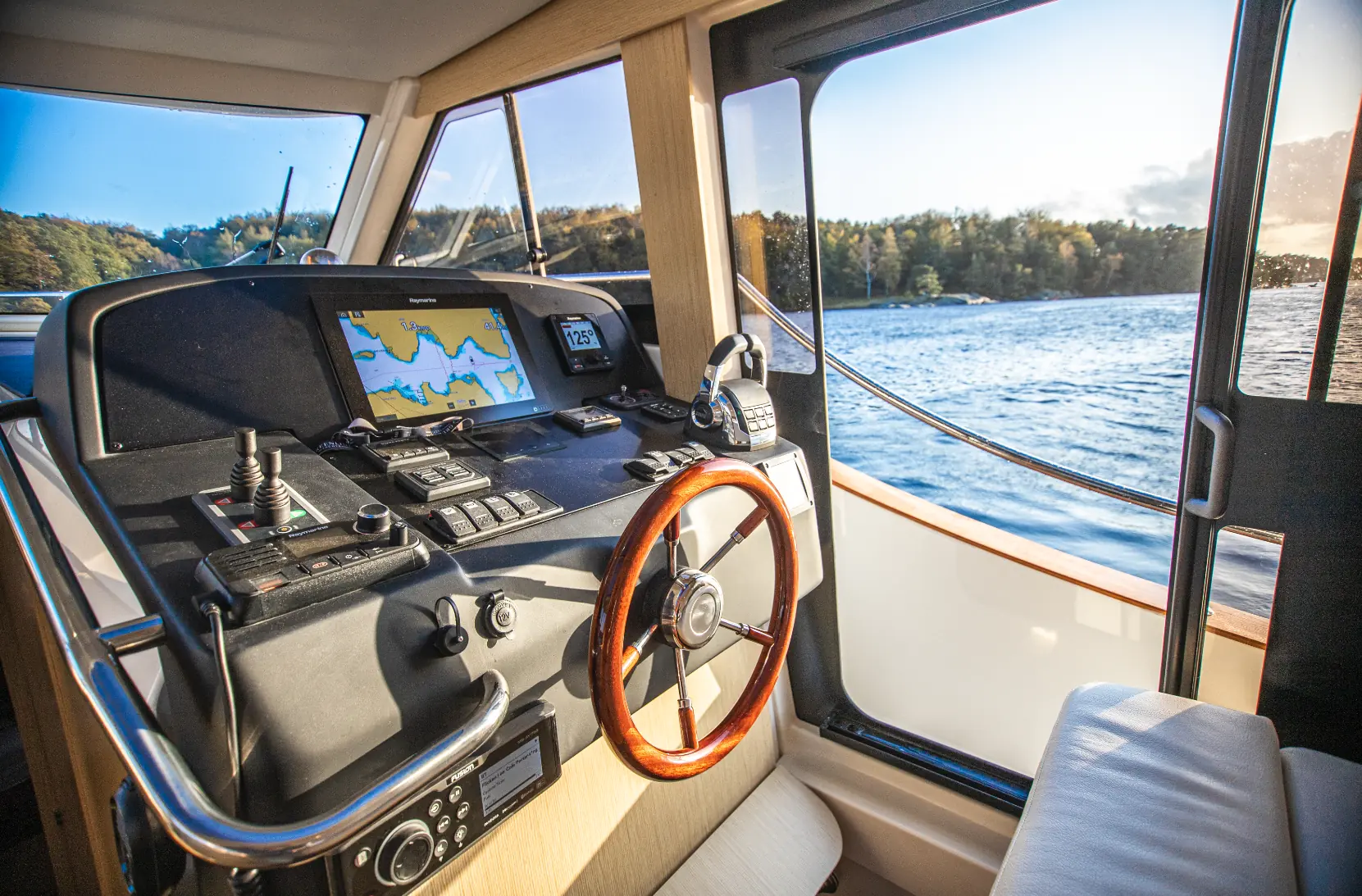 I vår testbåt finner vi 12-tommers kartplotter fra Raymarine, autopilot, VHF, Fusion stereoanlegg, lyskaster og batterimonitor som blant annet gir full oversikt over hele strømanlegget. De tre vindusviskerne med hastighetskontroll og spyleprogram er også verdt å trekke frem.