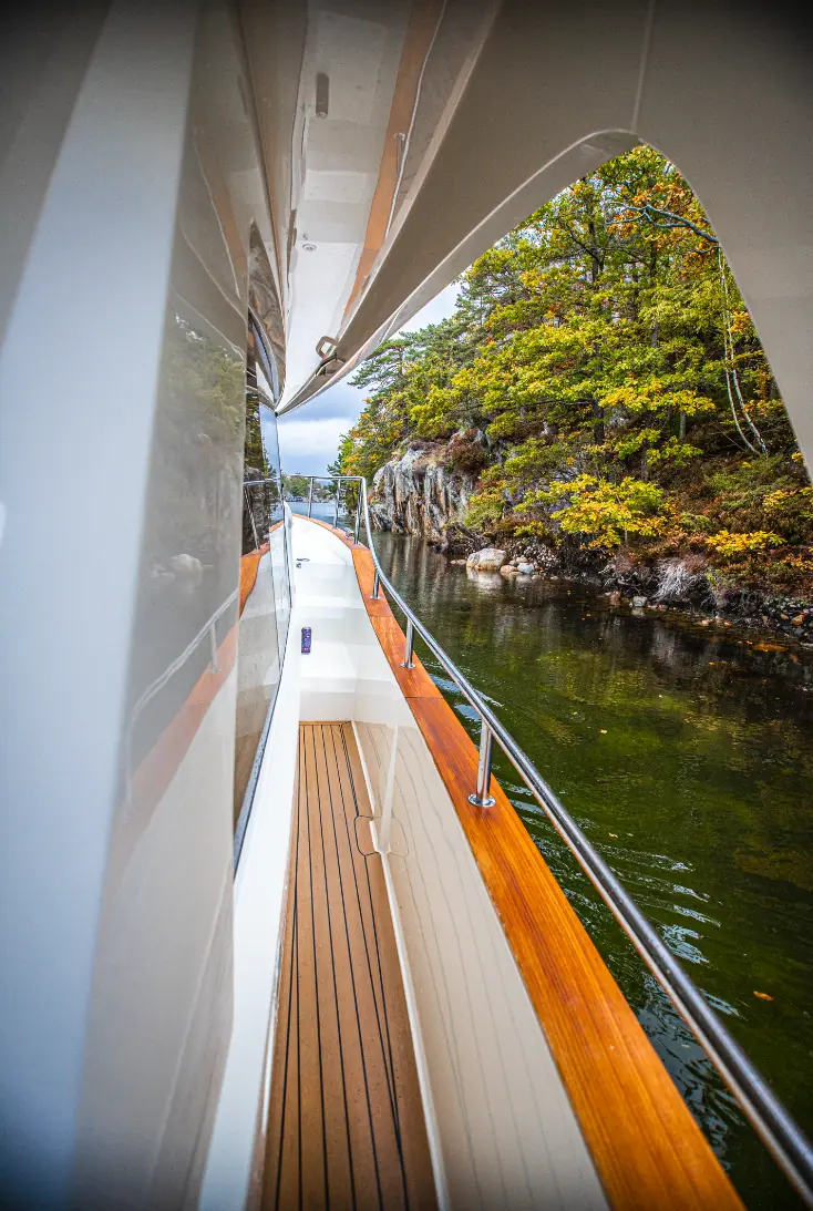 Greenline har nedfelte sideveier fra akter og frem til førerposisjonen som er litt bredere på styrbord side. Sammen med porter i skrogsiden og skyvedør ved førerplassen er båten enkel å håndtere selv for en person. Akterdekket er lukket med en badeplattform som senkes elektrisk, som gjør at uteplassen nesten kan bli dobbelt så stor. I dørken er det to store stuverom for sykler, kulefendere, utegrill og hva det måtte være – og i tillegg finnes to mindre lett tilgjengelige stuverom under hver sin sittebenk – bra!