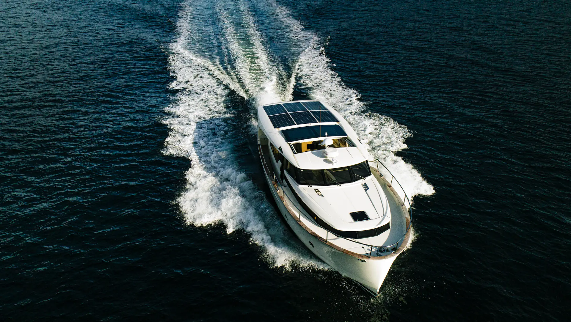 Greenline 40 leveres uten flybridge, og nesten hele taket er dekket med solcellepanel på 1,8 kW som standard. Sammen med inverter og 600 Ah lithium servicebatteri har du i de aller fleste tilfeller ikke behov for landstrøm for normalt forbruk. Under våre uker om bord var batteribanken aldri under 45 % (og lithium-batterier kan tappes helt ned) og landstrømskabelen aldri i land. Kjøleskap og fryser, varmtvannsbereder, matlaging, varmeapparat, TV og 220V-uttak – alt kan brukes nærmest uten å være redd for kapasiteten.