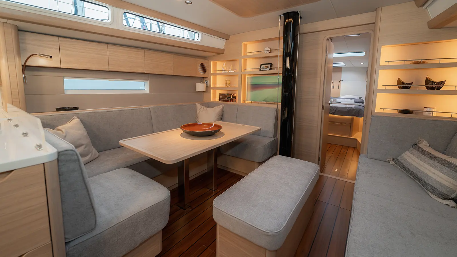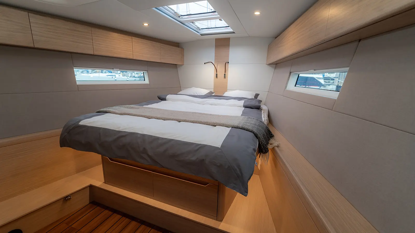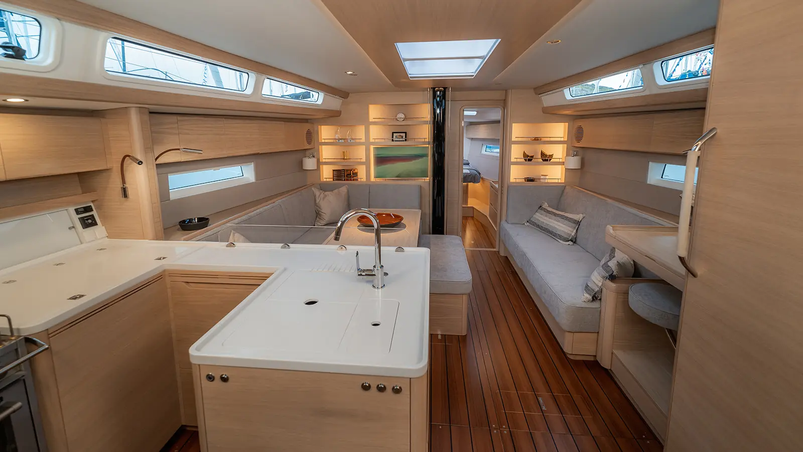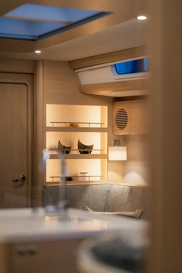 Under dekk er stilen minimalistisk og skandinavisk preget. Interiøret er laget av Khaya-mahogni og kan oppgraderes til skandinavisk lyst eiketre, og treverket er kjernebelagt for vektbesparelse.
