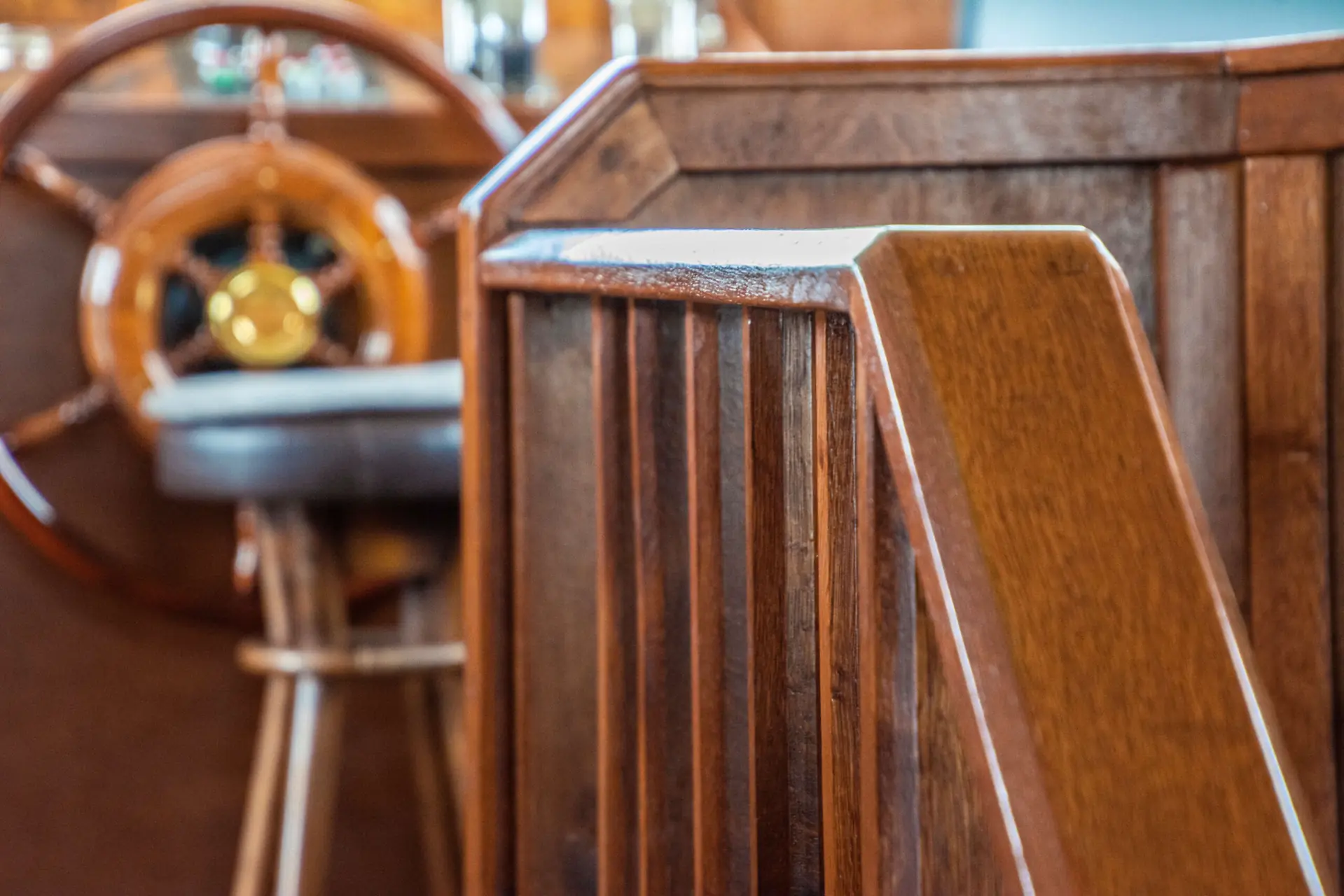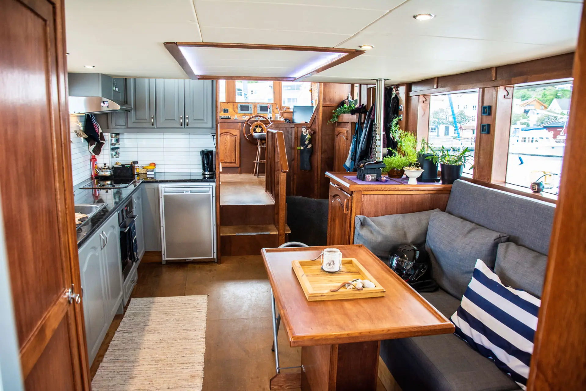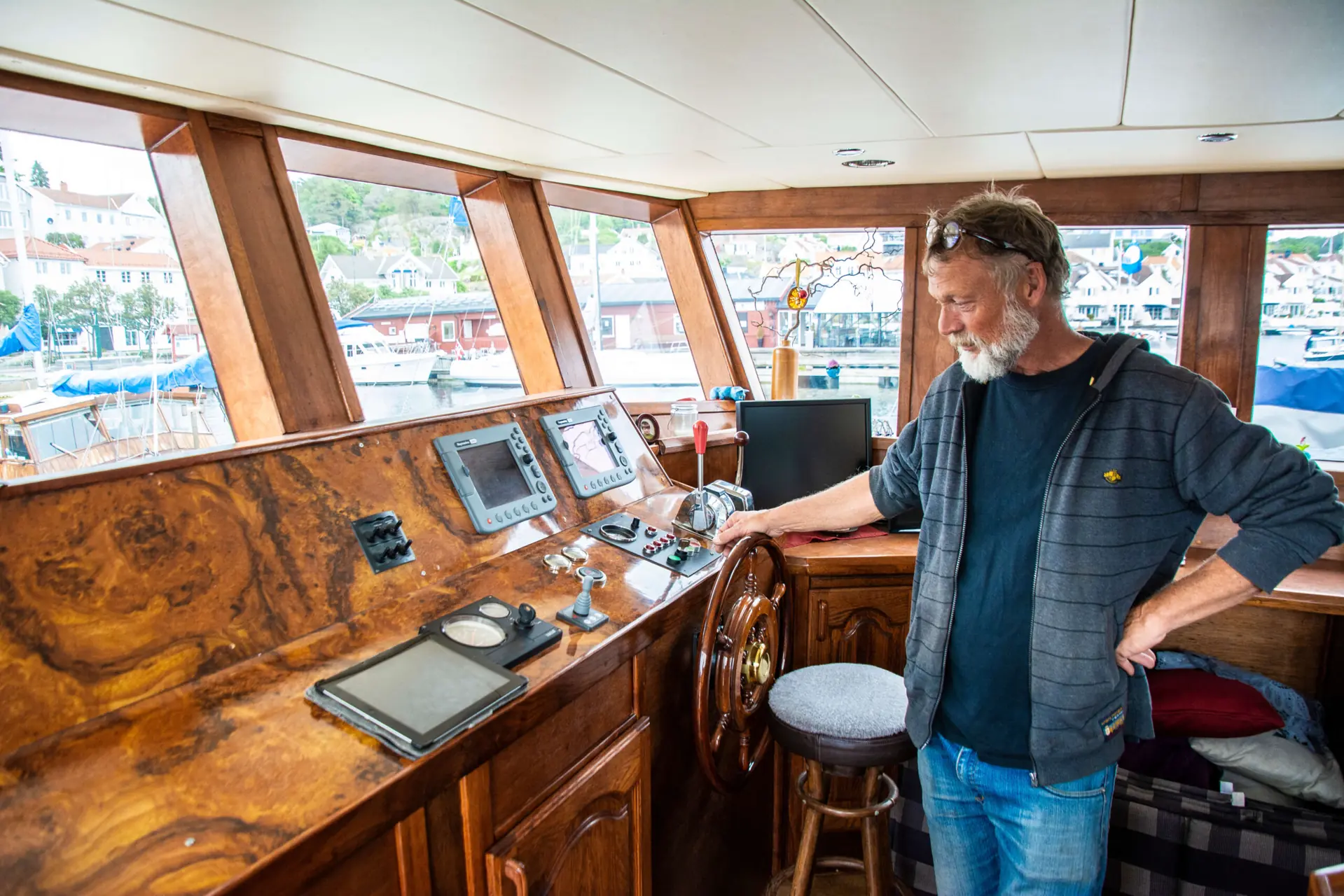 – Egentlig hele prosjektet, men hvis jeg skal trekke frem noe, så må det være at dette er blitt en fungerende bobåt, forteller Knut-Erik. Vi sitter i styrhuset og har panoramautsikt til Grimstad by. Denne salongen bruker paret mest.