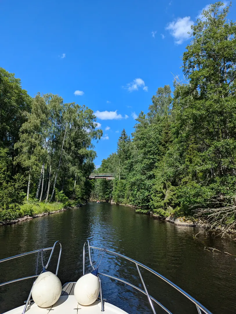 Turen i dag skulle gå fra Lennartsfors via Gustavsfors til Östra Silen. Før slusing måtte vi kalle på slusevakten og få bruåpning. Etter det bar det rett inn i dyp konsentrasjon og betydelig pulsøkning da første utfordring var å forsere en renne så smal at det egentlig ikke så ut til å kunne gå.