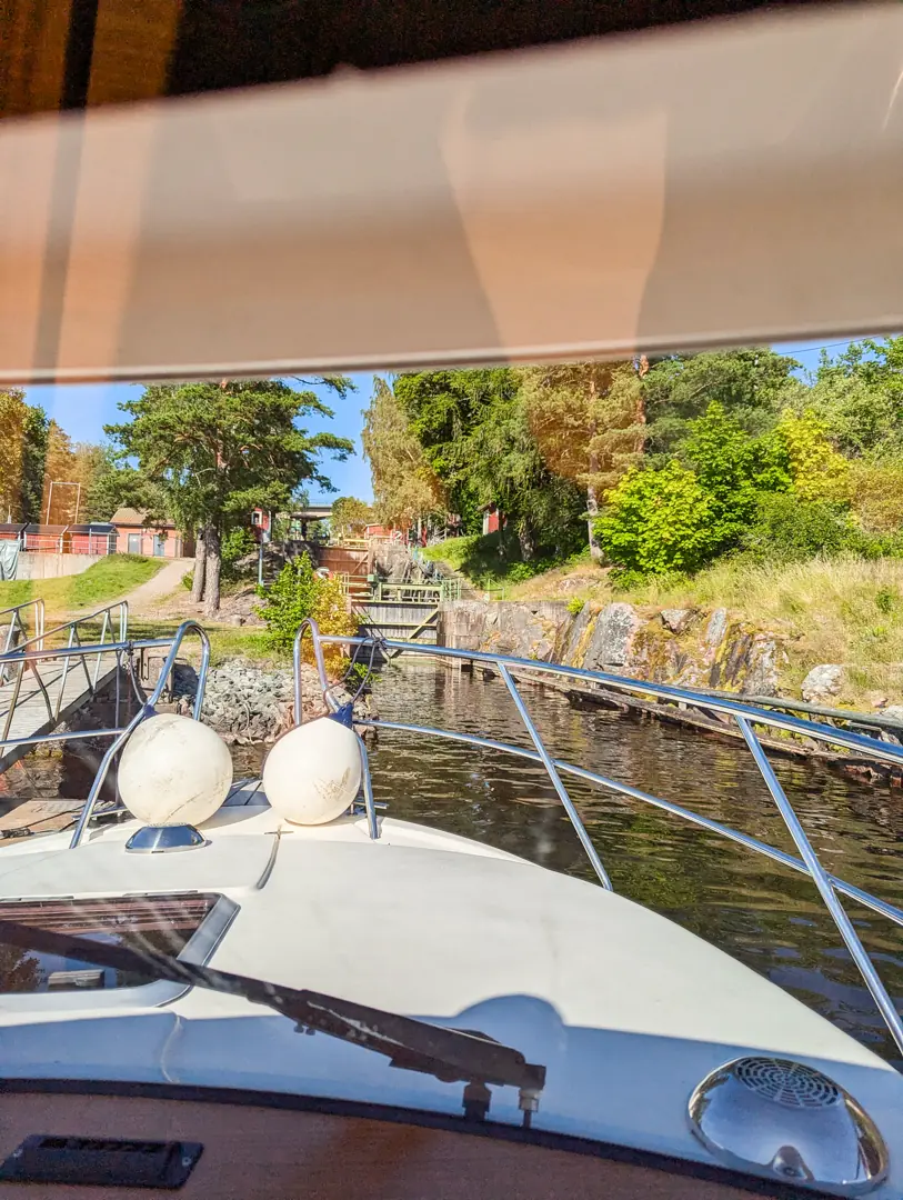 Men med sjarmerende ærlighet på egen tilkortkommenhet og godt samarbeid med oss, kom vi oss trygt opp disse to slusekamrene og var klare for siste etappe frem til Restön. En vakker, liten øy med brygge, fortøyningsbøyer, grillplass og svaberg.