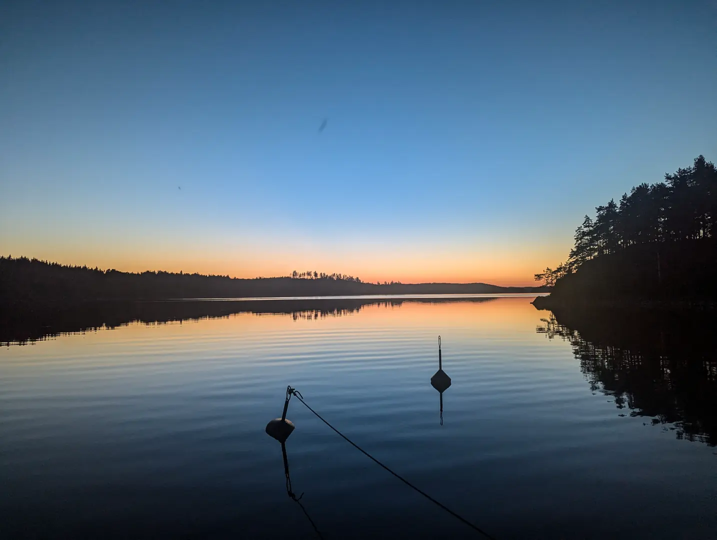 I knappe tre timer gled vi rolig gjennom vårt første møte med innlandsskjærgården vi skulle bli godt kjent med de nærmeste dagene. Store, åpne partier, men også holmer og trangere passasjer. Alt innrammet i vakker, grønn furuskog.