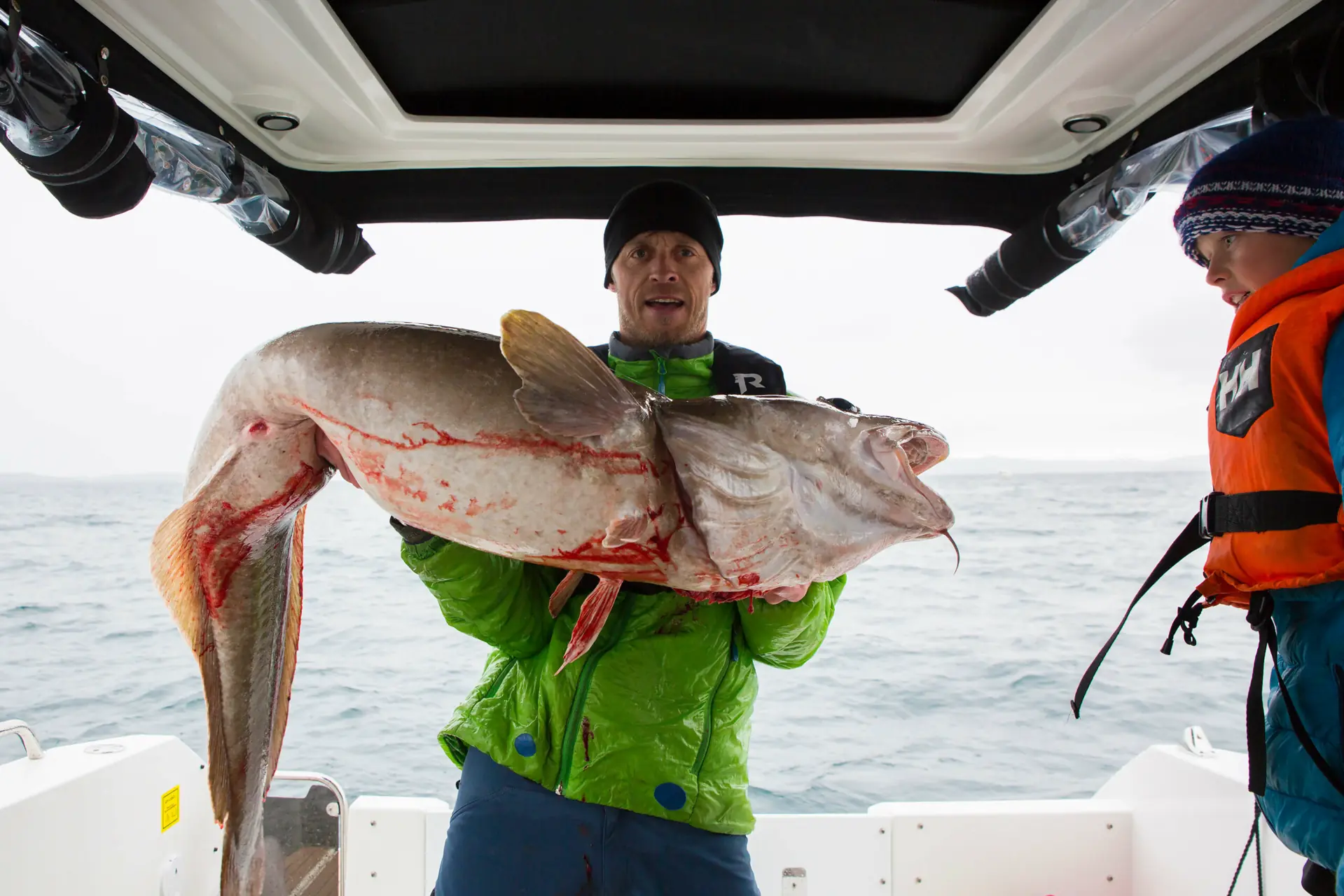 Sune (9) drar de rolig mot båten mens jeg bakker. Vi oppdager at den ene langen er virkelig diger. Men så ryker snøret! Den digre langen er nå helt fri og dupper i overflaten. Den er ikke død, men svimeslått og jeg ser den beveger seg. Den kan synke ned til bunns! Jeg roper til eldstemann Bo (11) og ber han kleppe langen for som svint! Han har kun kleppet fisk to ganger tidligere i livet sitt, så han er ikke særlig erfaren, men denne gangen treffer han perfekt! Sammen tar vi tak og løfter av all kraft fisken ombord i båten. Det er et enormt beist på hele 24 kilo og 164 cm, den største fisken vi noen gang har fått! Skal si vår nye Askeladden bringer fiskelykke!