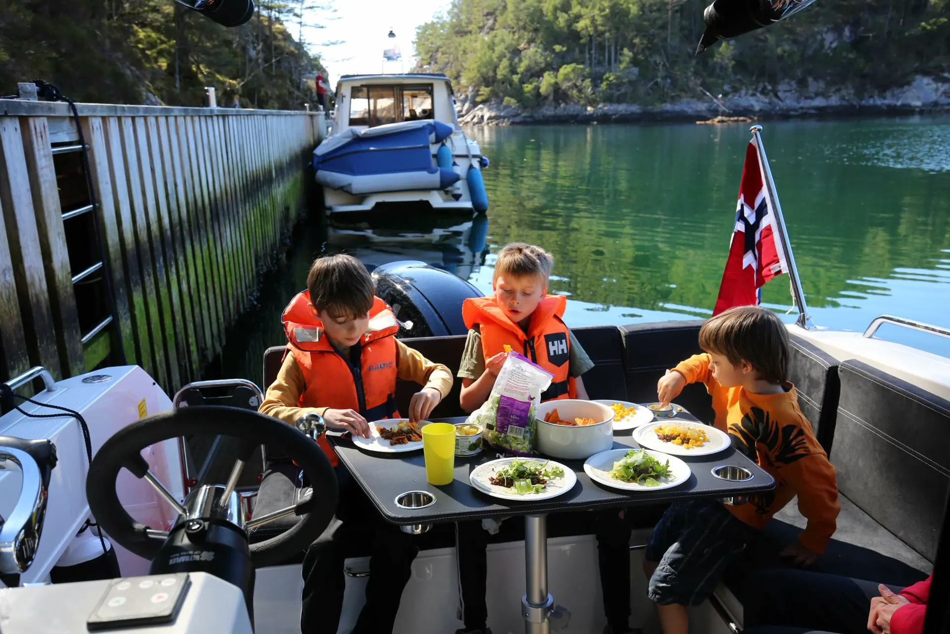 Men noen tabber kan være ganske morsomme faktisk! Som da jeg inviterte med meg et vennepar og deres tre barn på båttur og vi skulle legge til en flytebrygge. Med 11 personer i båten, barn og voksne, var det et herlig kaos. Jeg legger fint inntil, dekksguttene mine Bo og Sune og førstestyrmann Line hjelper til. Vi fortøyer – dette går som en lek! Eneste problemet er at flytebryggen vi har lagt inntil ikke er festet til land! Vi kommer oss ingensteds! Da får vi oss en god latter! Dette burde vi jo sett før vi la oss inntil. Nok et nytt punkt føres opp på min mentale læringsliste.