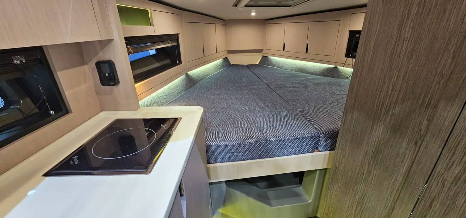Også under dekk er det romslig. Her finnes eget toalettrom, bysse og komfortabel soveplass for to personer. Måten Windy har integrert vinduer i skrogsiden, skap og hyller som en del av innredningen, og generelt har utformet kabinen på, skaper en eksklusiv atmosfære her.