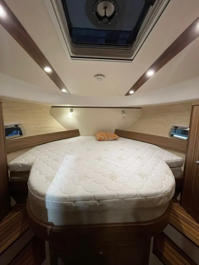 Saga 385 har to separate lugarer under dekk. Midtkabinen er særdeles voluminøs med to brede senger som fint kan benyttes av to-fire personer. Eierlugaren ligger helt forut, med en stor, midtstilt dobbeltseng. Også baderommet er romslig med egen, lukket dusj med eget sete.