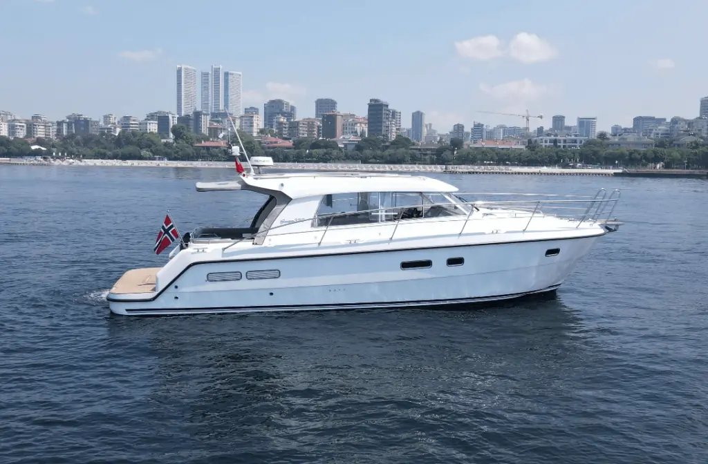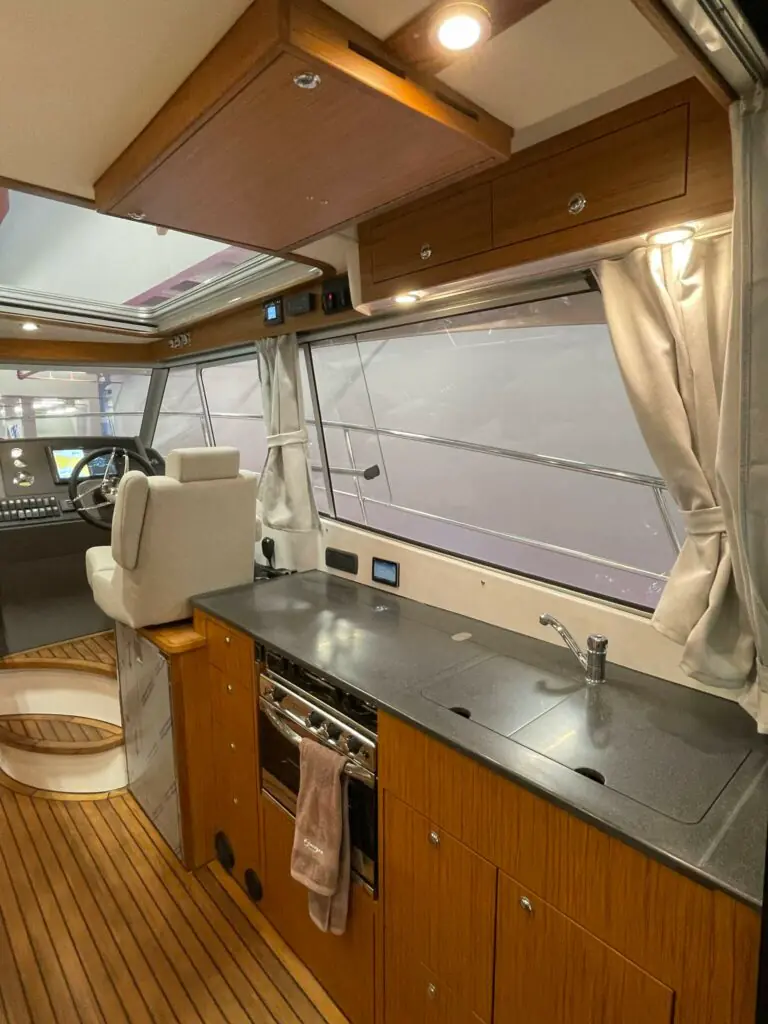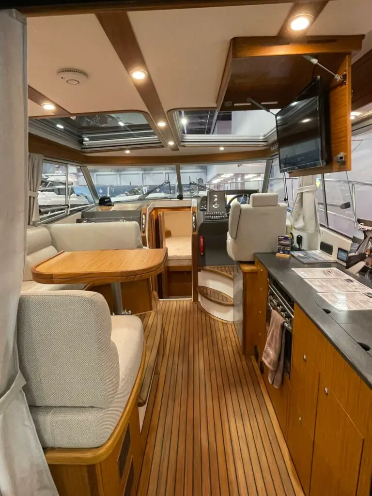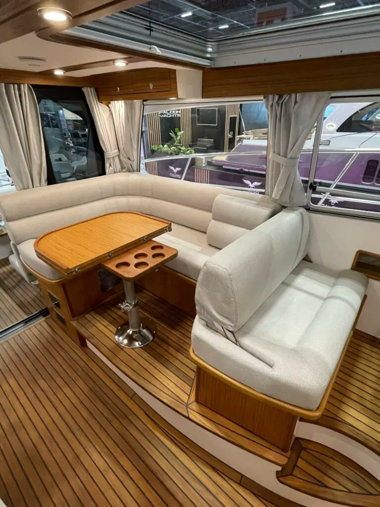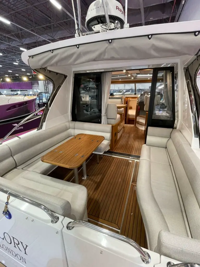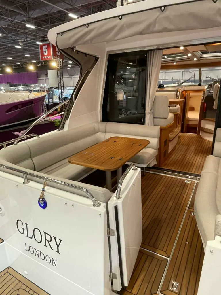 Båten er også lukket med akterdekk som kan åpnes på varme soldager eller lukkes inne med kalesje. En stor L-salong med eget spisebord gjør at du kan ta middagen i det fri, og nytt er at ekstra sofa er tilgjengelig som ekstrautstyr på styrbord side på akterdekket.
