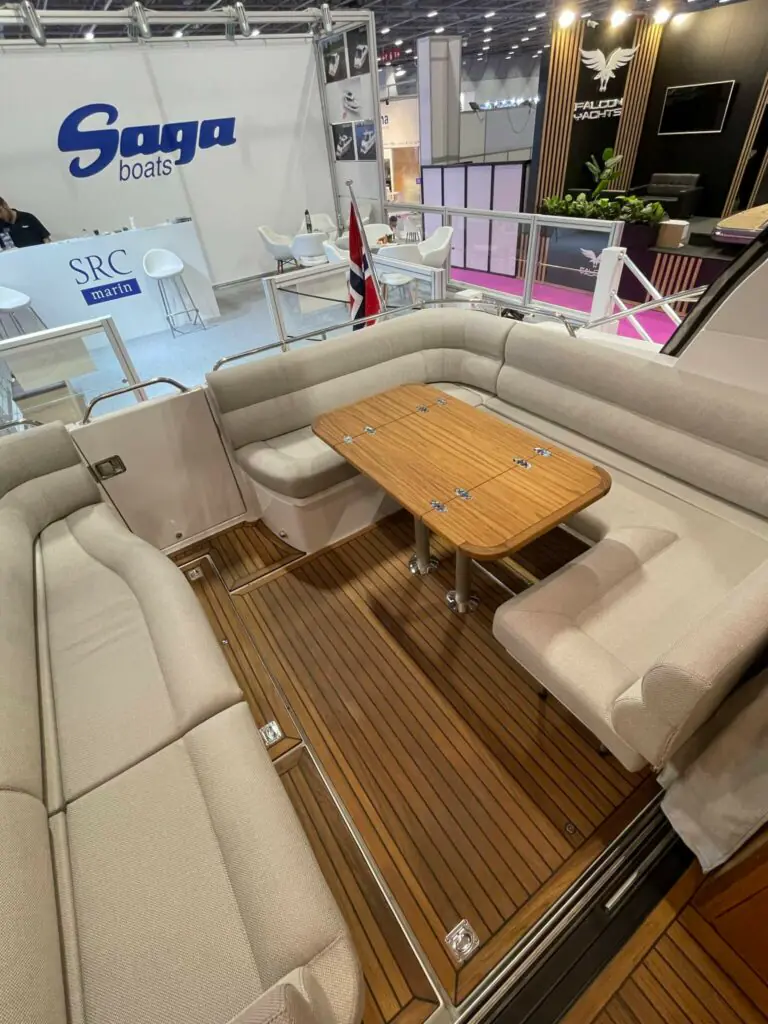 Saga Boats har egen avdeling i Leangbukta Maritime Senter, og i utstillingen finner du blant annet Saga 385. Nytt av året er at båten kommer med treinnredning i amerikansk valnøtt, og har fått oppgradert og moderne dashbord. I tillegg er Saga et verft som i stor grad skreddersyr båtene etter kundens ønske, hva gjelder farger, materialbruk, motorvalg og liknende.