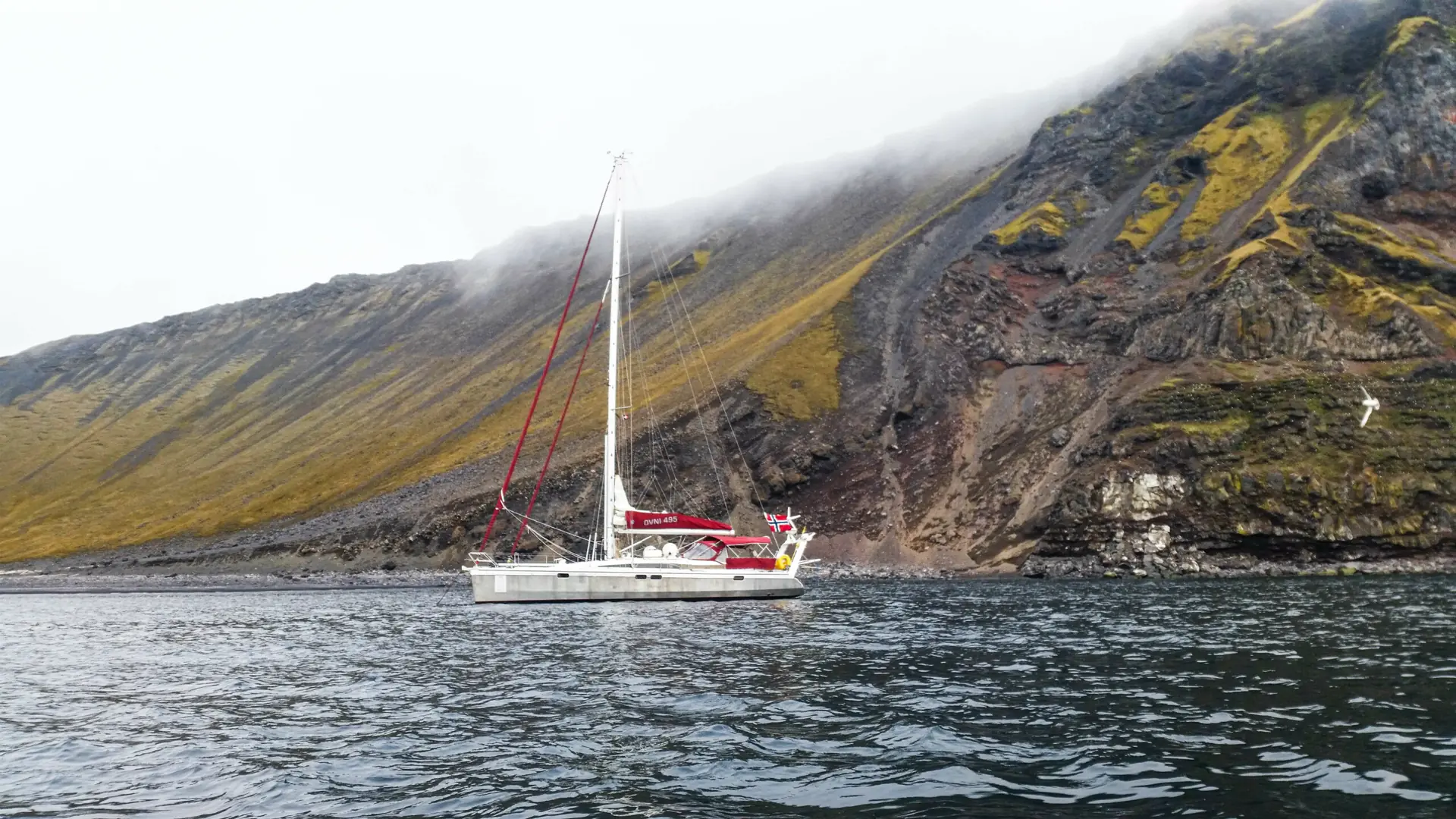 Dagen etter kommer en islandsk seilbåt med skiturister som skal klatre opp fjellsiden og sette utfor den eksotiske og naturlige utforløypa. De har alltid skipperen om bord. Det er alltid mye strømmer og dønninger her. Derfor tør vi ta imot kommandantens innbydelse til den andre siden, der forsvaret og meteorologiske holder til.