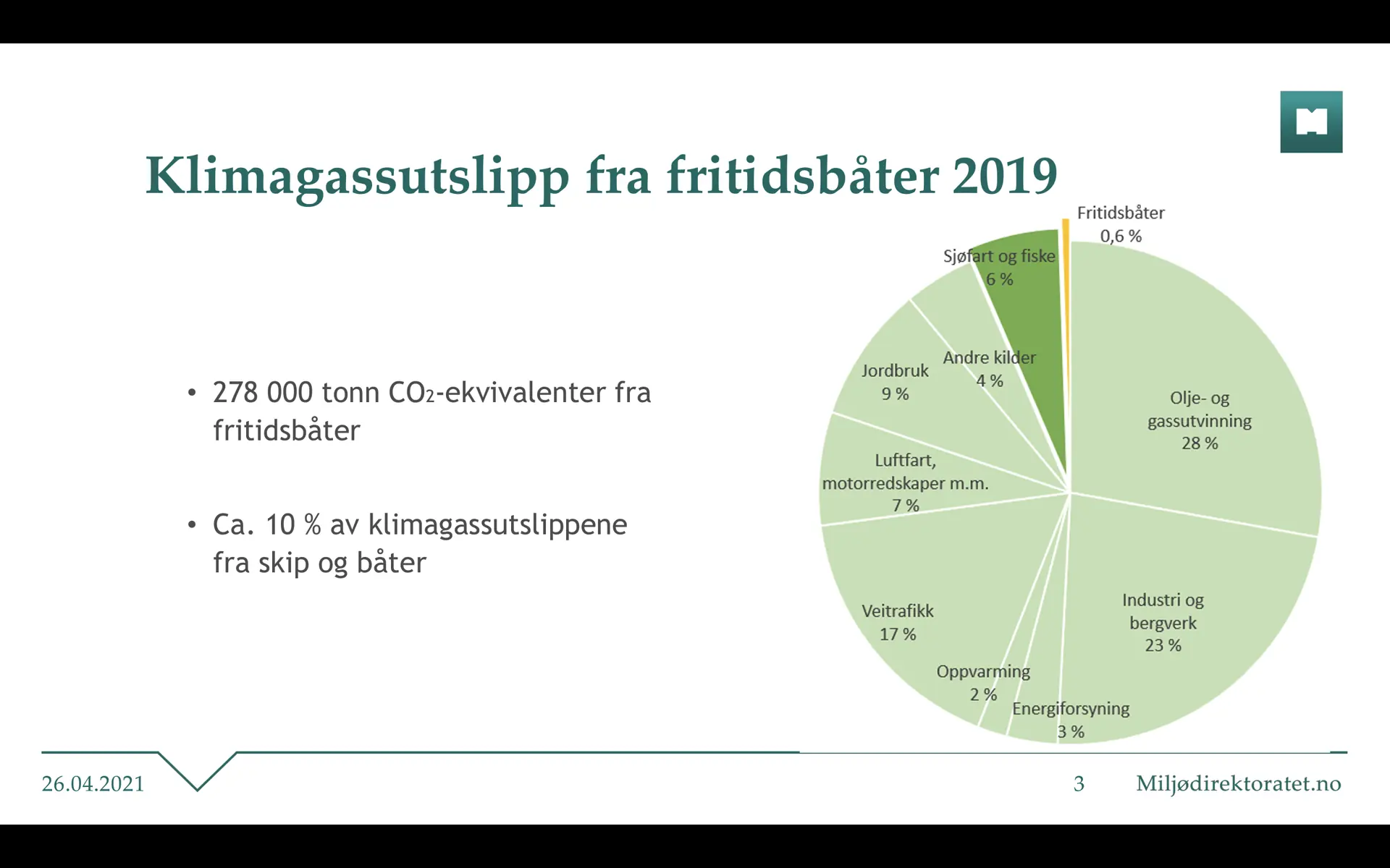Av Norges Klimagass utslipp er det totalt sett 10% fra Sjøfart, Fiske, Andre kilder og fritidsbåt. Fra fritidsbåt alene er det 0,6%, mens sjøfart og fiske står for 6 % og Andre Kilder er 4%.