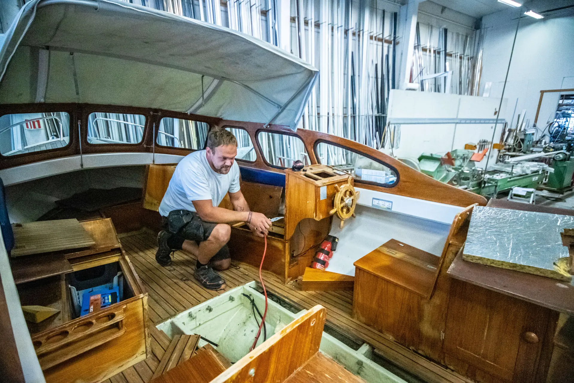 Når vi er innom verkstedet står en Polar 22 fra 90-tallet i hallen for å få byttet ut sin 28 hk. dieselmotor til en 4 kW elmotor med fire batterier på hver 2,5 kWh og 50 Ah – og dette er 24. elektrifiseringsprosjekt så langt i år.