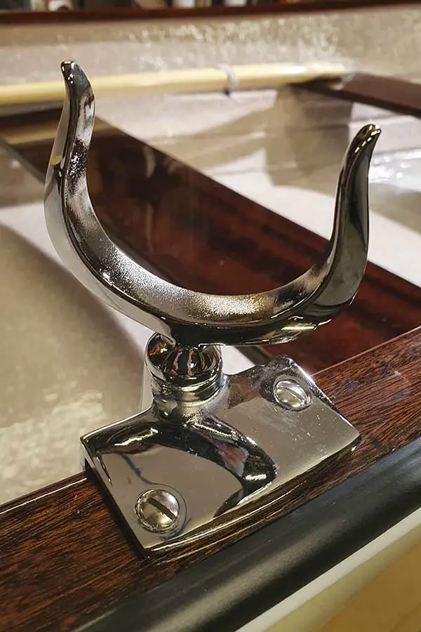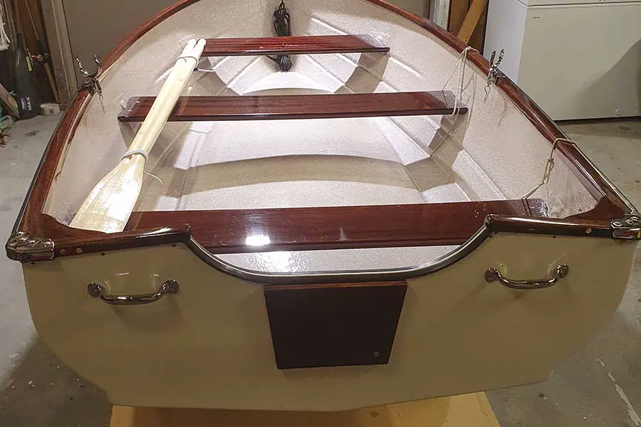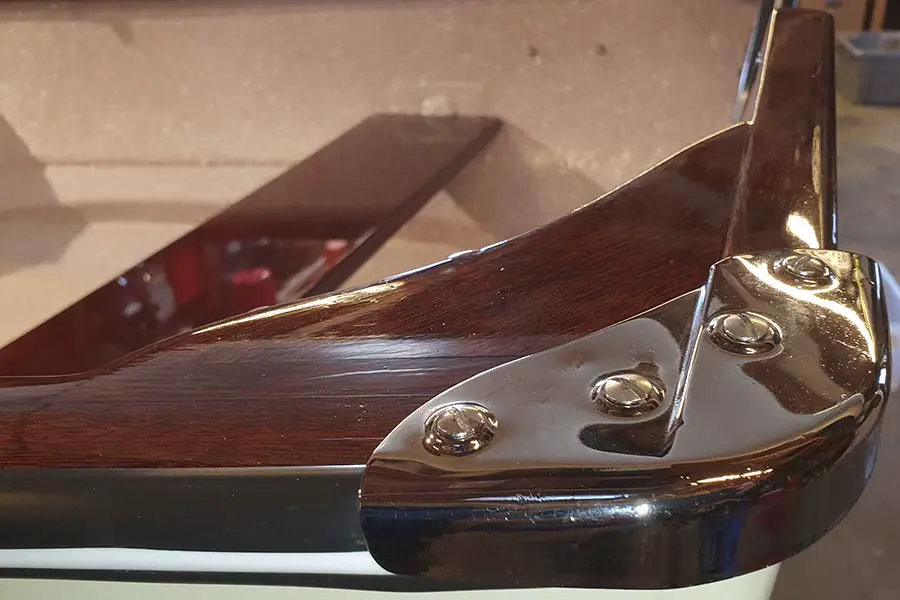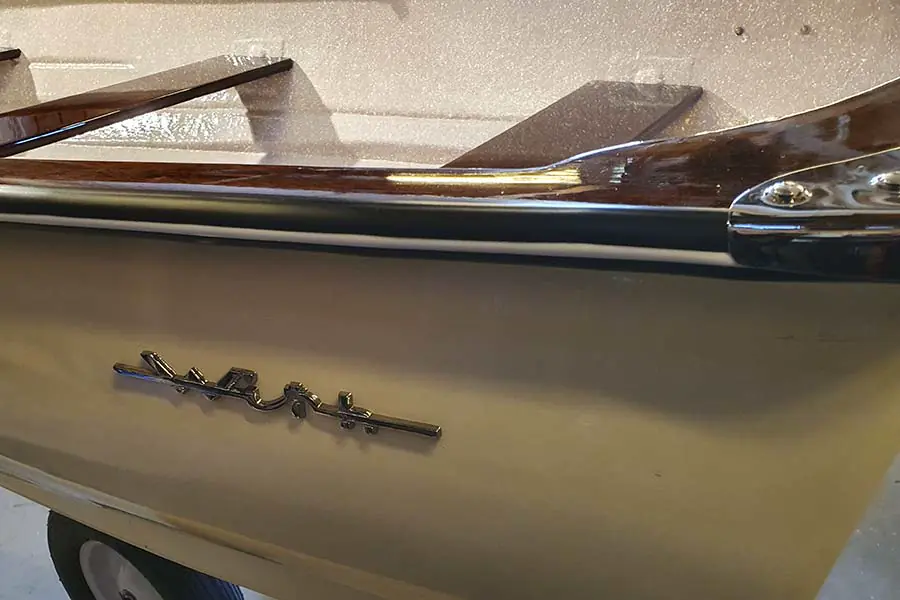 Eksemplaret fra 60-tallet fremstår som helt strøken og som ny. 17 strøk Rylard har gått med til å gi mahogni, reling, tomter og akterplater speilfinish. Skroget er som nytt utvendig og innvendig, sprøytemalt av Sigurd. Alle beslag er restaurert med ny krom – og motoren er totaloverhalt.