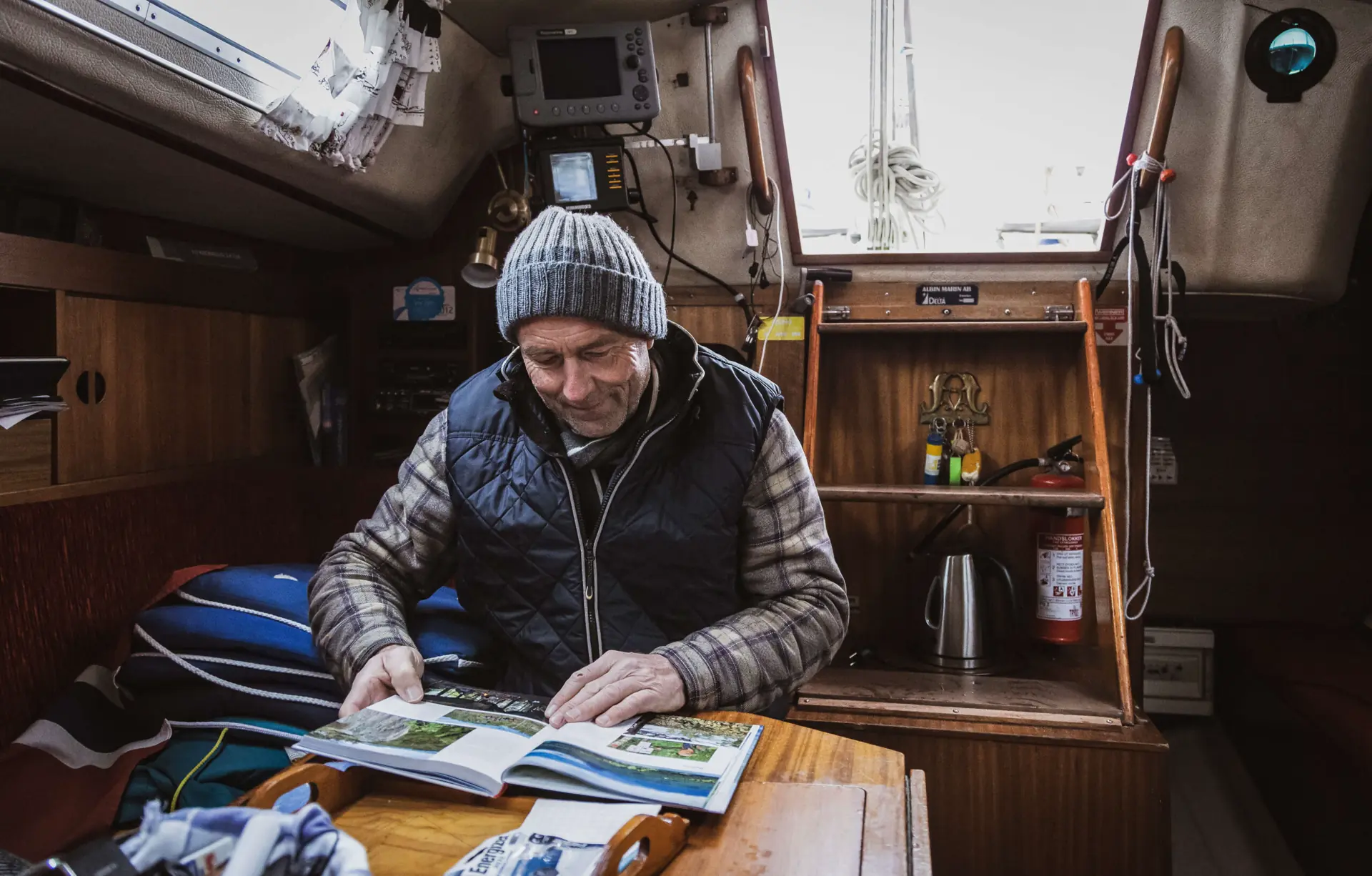 Vi er på Os Seilforenings kaianlegg og Geir inviterer meg med ned i seilbåten hans, en 31 fots Albin Delta fra ´83. I salongen lukter det deilig blanding av diesel og kaffe. Turbøker og kaffekrus fra ulike havner ligger spredd om hverandre.