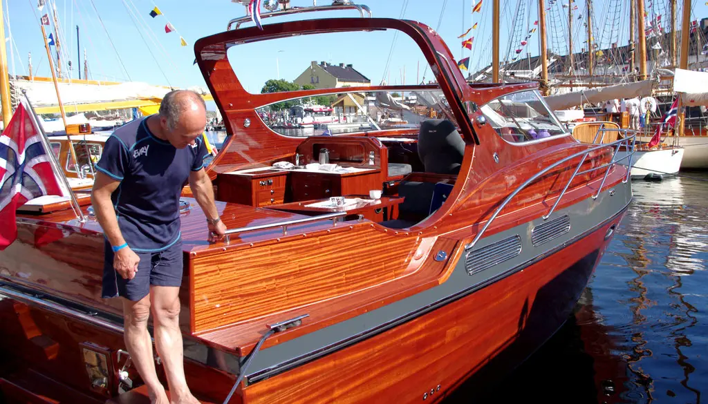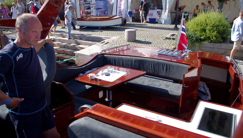 Hatlevoll har allerede gått båten fra Arendal, til Luster i Sogn i sommer. Overalt hvor han kom på Vestlandet har båtfolk og andre latt seg imponere av båten, som har et 5mm mahogni lag utenpå furufiner.