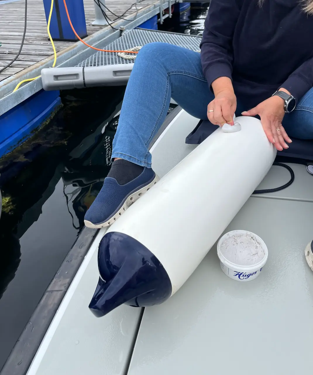 Til daglig vask hadde vi med båtsjampo og Hugos til vask av skutesider, dekk og fendere. Hugos bruker vi til de små og gjenstridige flekkene fra skosåler og skitne vannslanger, samt all skitten som fenderen får på seg langs alle mulige kaier og fjellvegger.