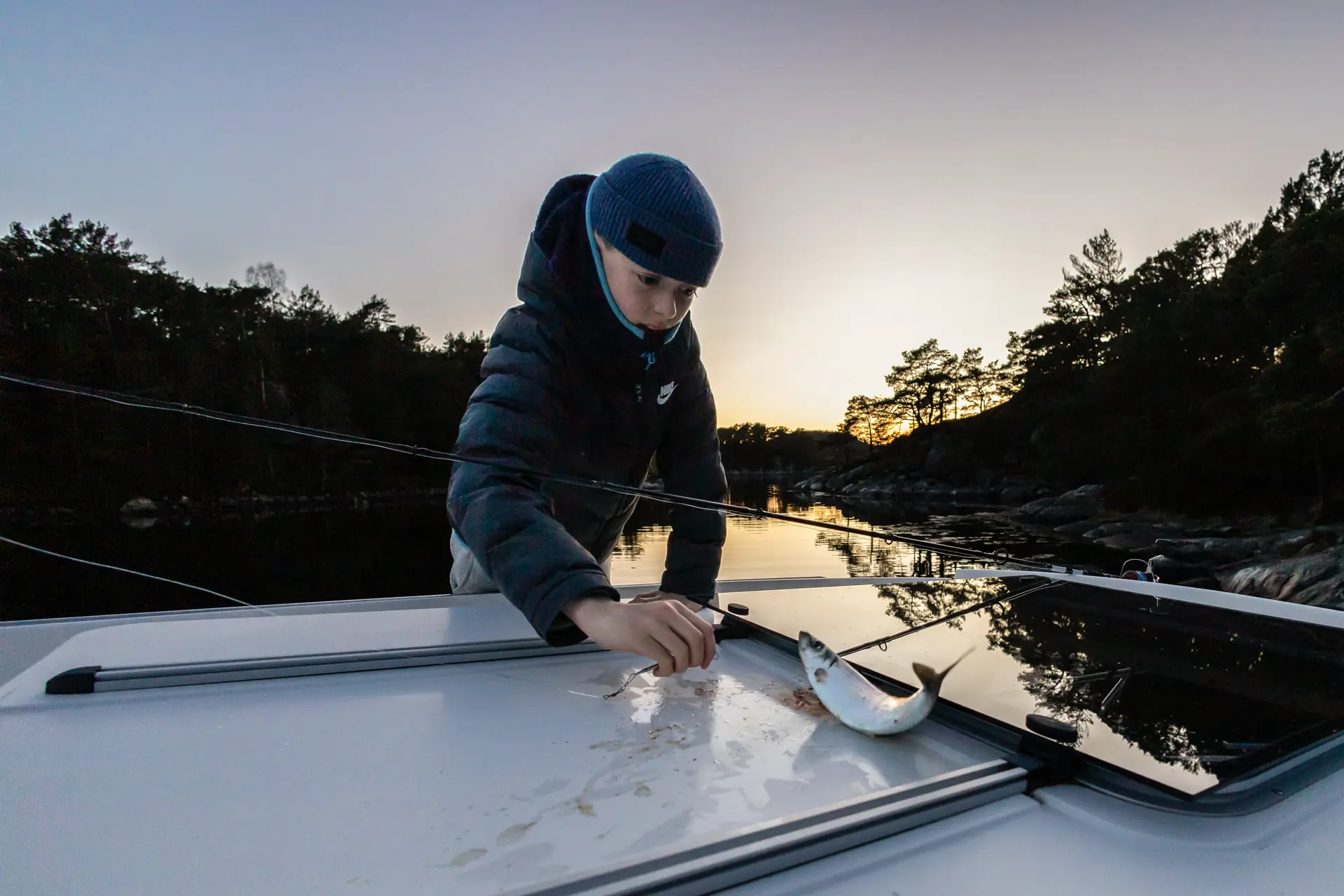 Lyder er bare 11 år og han får normalt ikke kjøre alene i båten. Jeg kjenner jeg blir litt urolig når han er borte, jeg kan ikke se ham, og skal til å ringe når jeg ser han kommer tilbake etter å ha vært vekke en ti minutters tid. Han har en tåre på kinnet.