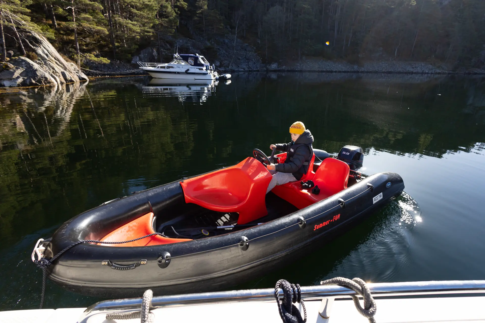 – Men båten flytter hele tiden på seg, jeg kommer ikke inntil, roper Lyder (11) fra sin Summerfun noen meter fra meg.