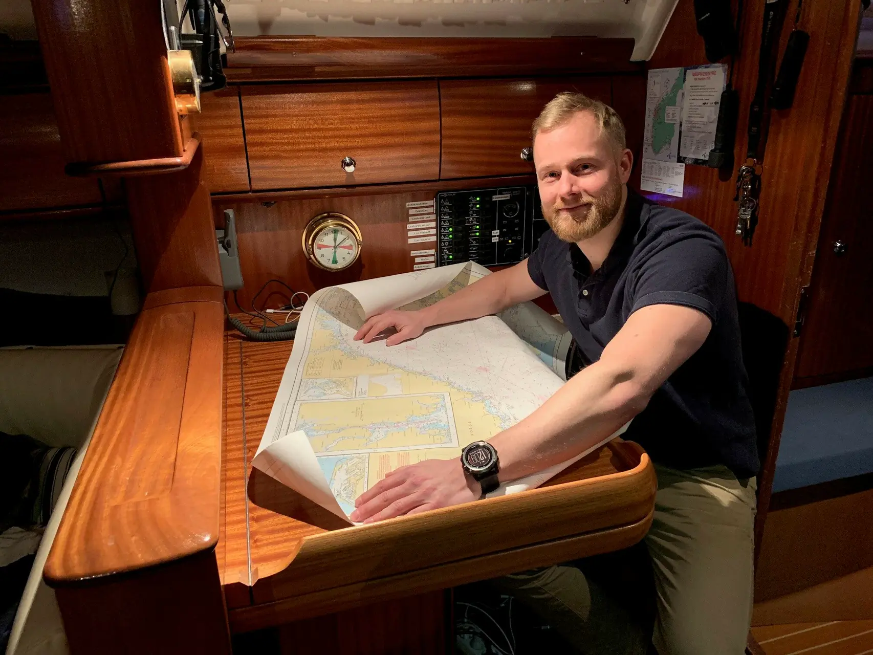 Ombord er det ett toalett, to akterlugarer og en stor dobbelkøye i forpiggen. – Jeg sover forut. Akterlugarene er store, og der har jeg sommerklær og ekstrautstyr. Kartbordet funker supert som kontor, og salongen innbyr til sosial trivsel. Juledagene skal tilbringes hjemme hos foreldrene på Strømmen. Gutterommet står alltid klart.