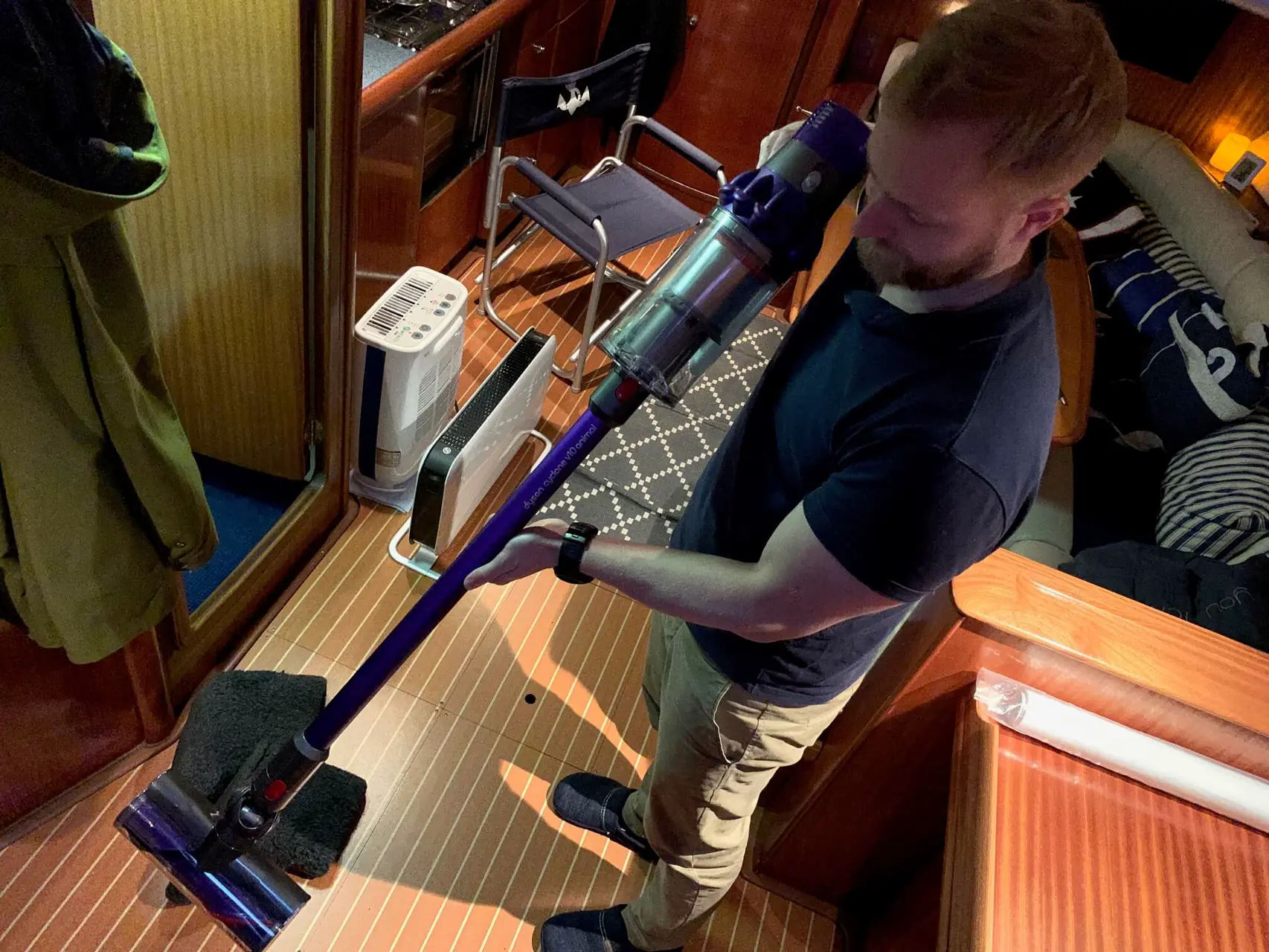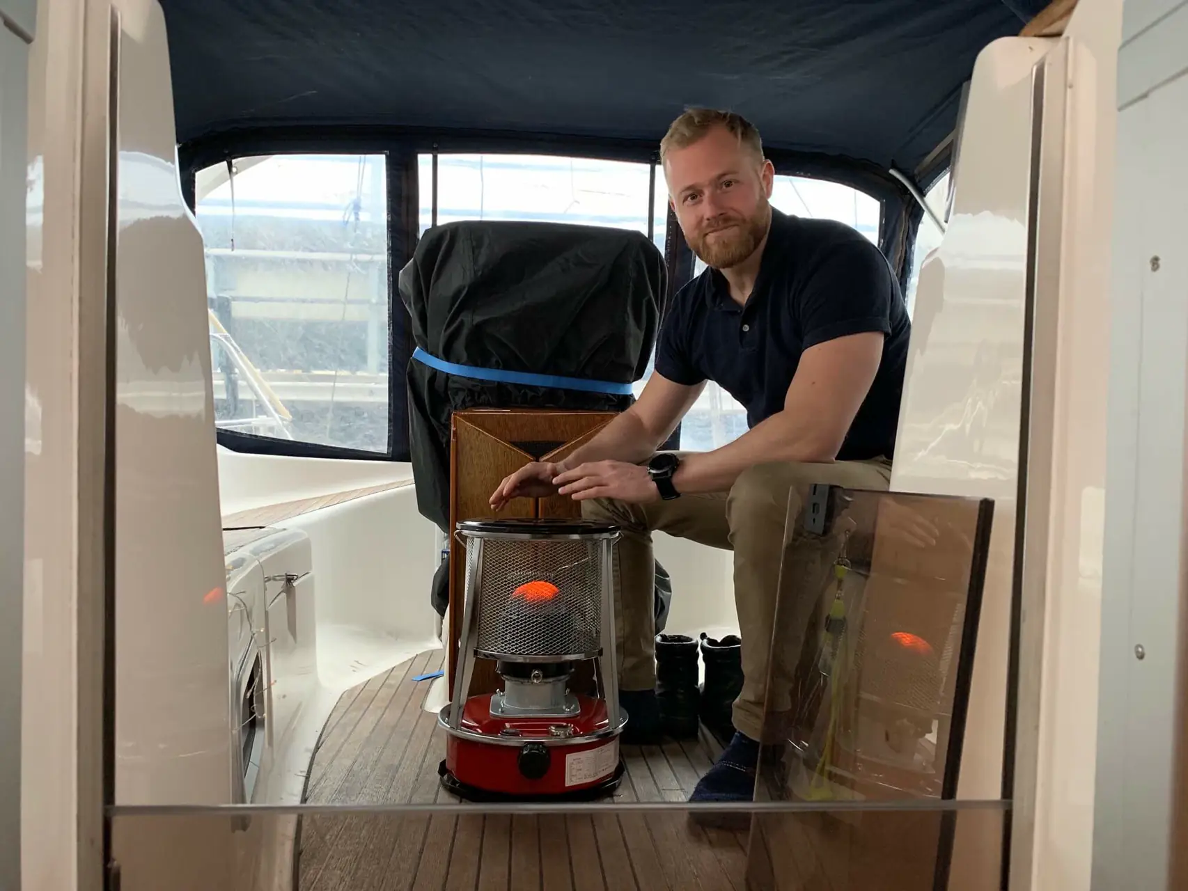 Bavariaen er helt dekket av presenninger. Cockpiten også, i tillegg til teltet. Ute, var det surt og kaldt, ca 2 minusgrader. Inne, her om bord, er det annerledes. 21 grader føles herlig. Kaffekanna står på komfyren, jeg gleder meg til en kopp nå. Varmen kommer fra en høy, stødig vifteovn. Luftavfukteren gir fra seg litt varme den også. Det er rett og slett koselig her.
