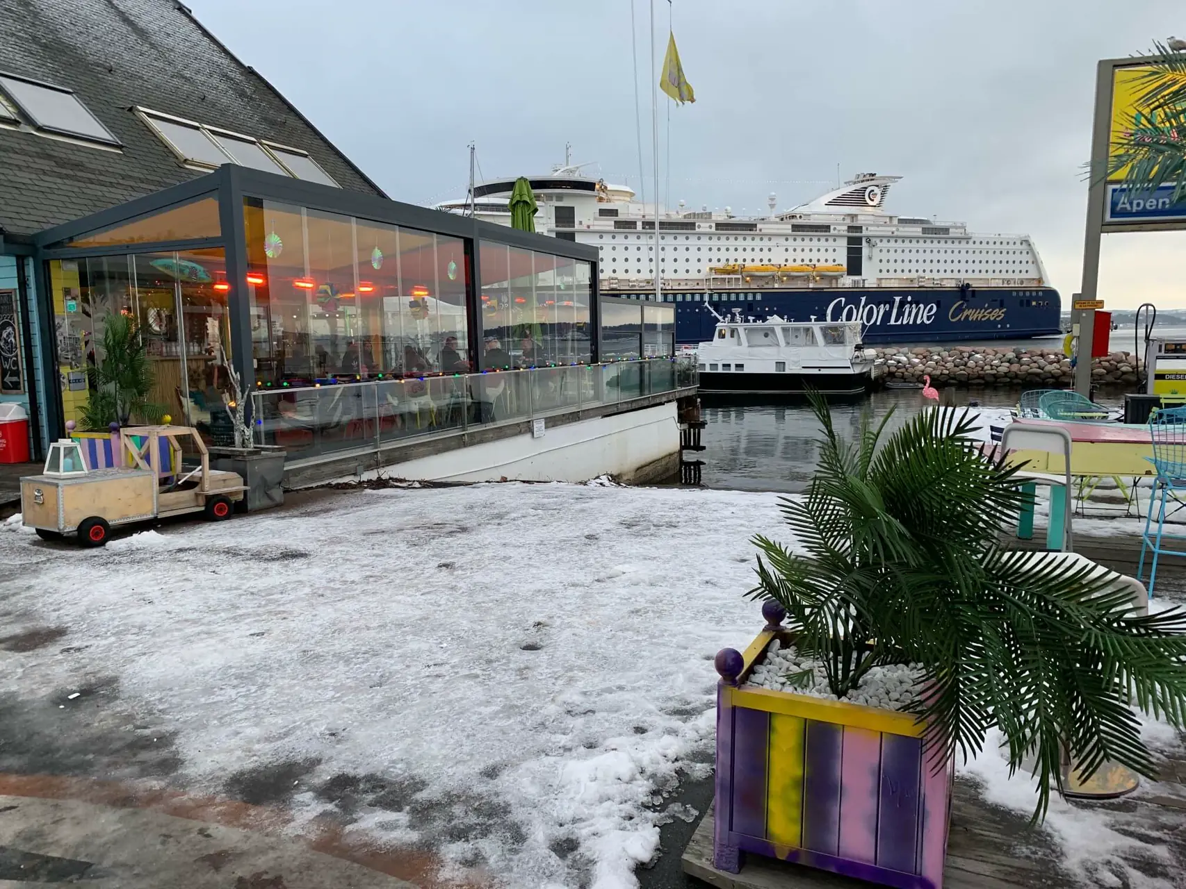 Det er mange som bor her, i båtene sine. Alt fra lektere hvor trivelig røyk fra peisen om bord, finner veien ut gjennom pipa. 100 meter lenger ut, ligger Color Magic. På vei ut på bryggene, passerer jeg flere seilbåter. Helt tydelig bebodde. Sven Pettersen vinker. Han står ved siden av en Bavaria 38.