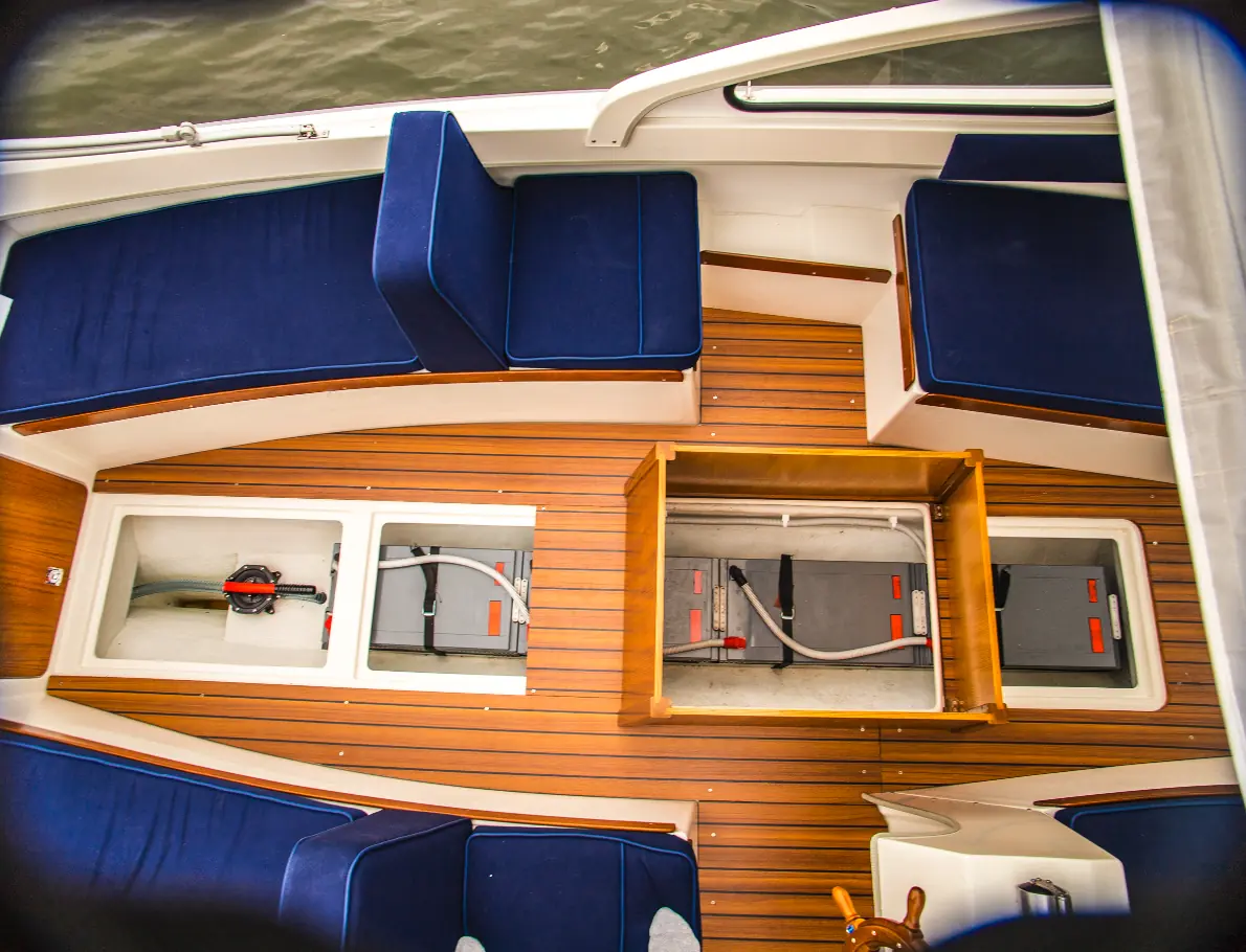 Batteriene gir god ballast og er plassert i kjølen, og vår batteripakke består av fire AGM blybatterier på 256 amperetimer hver, seriekoblet til 48 volt. – Motorsystemet er på 48 volt, men vi tilbyr også lithium. En klar fordel da vil være 30 – 40 % mer kapasitet, men prisdifferansen er fortsatt skyhøy, over 100.000 kroner fra fabrikk, forteller Sværen.