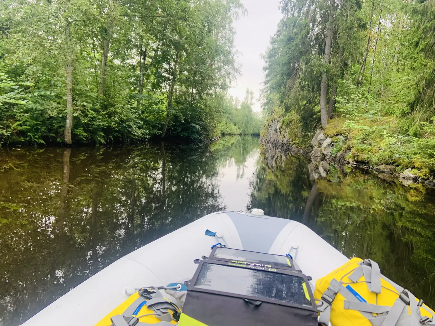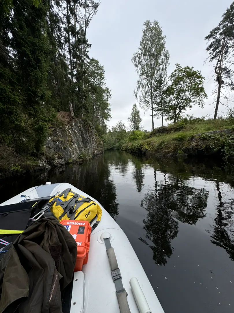 Tredje døgnet på kanalen, våknet vi til tykkeste morgentåken - og vi kunne ikke bevege oss ut med Zodiac'en på innsjøen Barken. Dermed måtte vi avblåse det avtalte tidspunktet ved slusene. Vente ett døgn, var ikke aktuelt. Vi pakket sammen, og tok avgjørelsen med å avblåse slusene - og forflyttet oss ned til Mälaren.