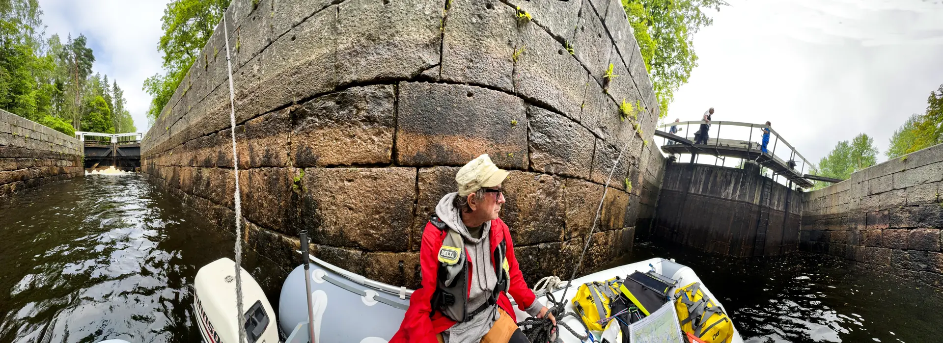 Vi ble møtt av unge hyggelige blågul-kledte slusevakter, som aldri hadde fått servert høylytt sang som gjallet nede i de trange sluseportene på svorsk og med ekko: "Jag trivs best i öppna landskap". Dette ble kommentert på avslutningsfesten deres rundt bålet, fikk vi vite senere. Bare hyggelig å legge igjen et godt «visittkort», midt mellom de små åpningene i de store skogene på vei sørover.