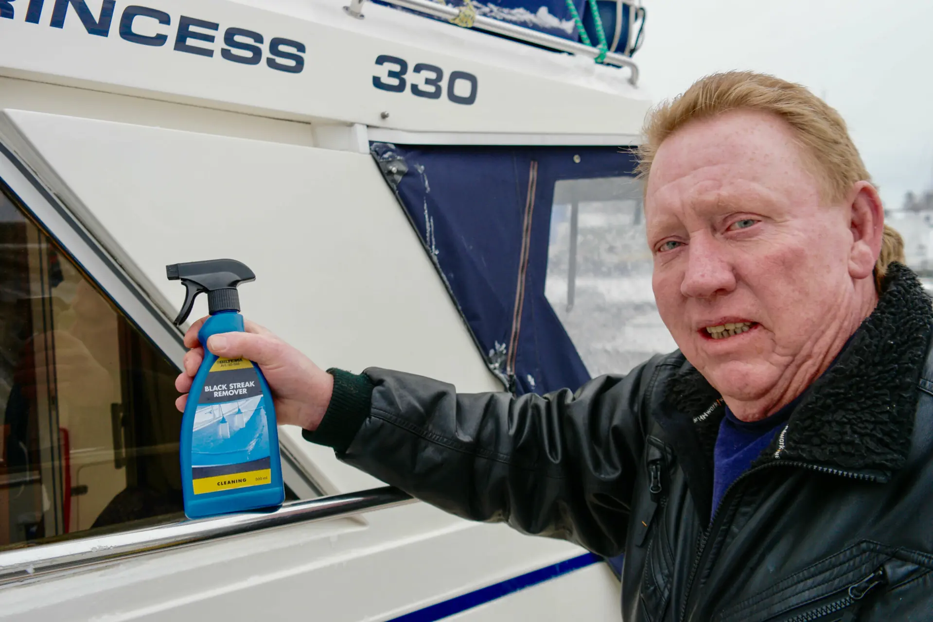 – Denne er bare helt suveren, sier mangeårige båteier, Ove Dybvik (64) fra Sætre. Han viser frem Biltema`s «Black Streak Remover» som han forteller at han bruker hele året.