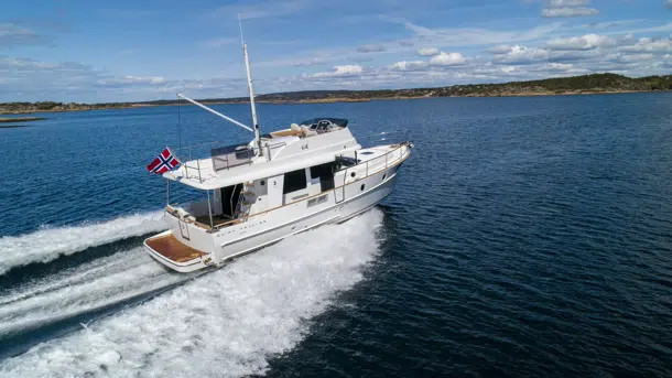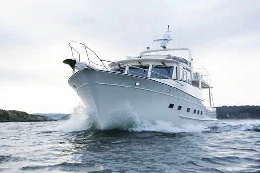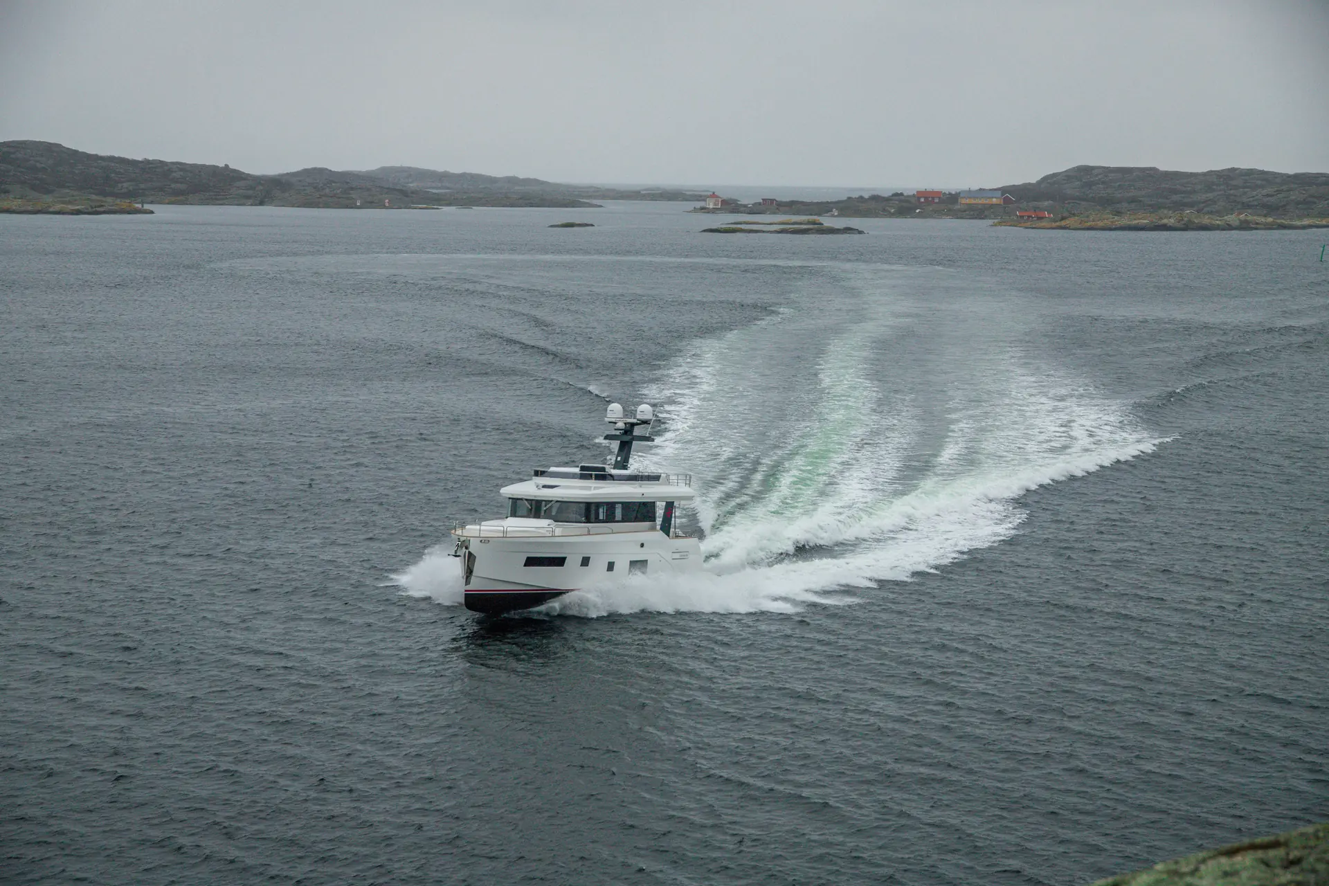 Båten er klassifisert i CE-kategori A, som gjelder båter som kan gå over lengre havstrekk, tåle vindstyrker over 8 på beaufortskalaen, og bølgehøyder over fire meter. Båten leveres med to stykker Volvo Penta D11 670 hk., som på vår testbåt, eller 2xD13 på 900 hk. Forskjellen i toppfart skiller tre knop, fra 25 til 28 knop, og en typisk marsjfart er 16 knop. Mest drivstofføkonomisk er båten i 9-10 knop, og med 3 600 liter dieseltank skal rekkevidden være like over 850 nautiske mil med 10 % margin. I 8 knop måler vi et forbruk på 2,3 liter per nautisk mil, mens vi i 9 knop får et forbruk på 3,3 liter per nm. I 18 knop viser måleren cirka 9 liter per nm.