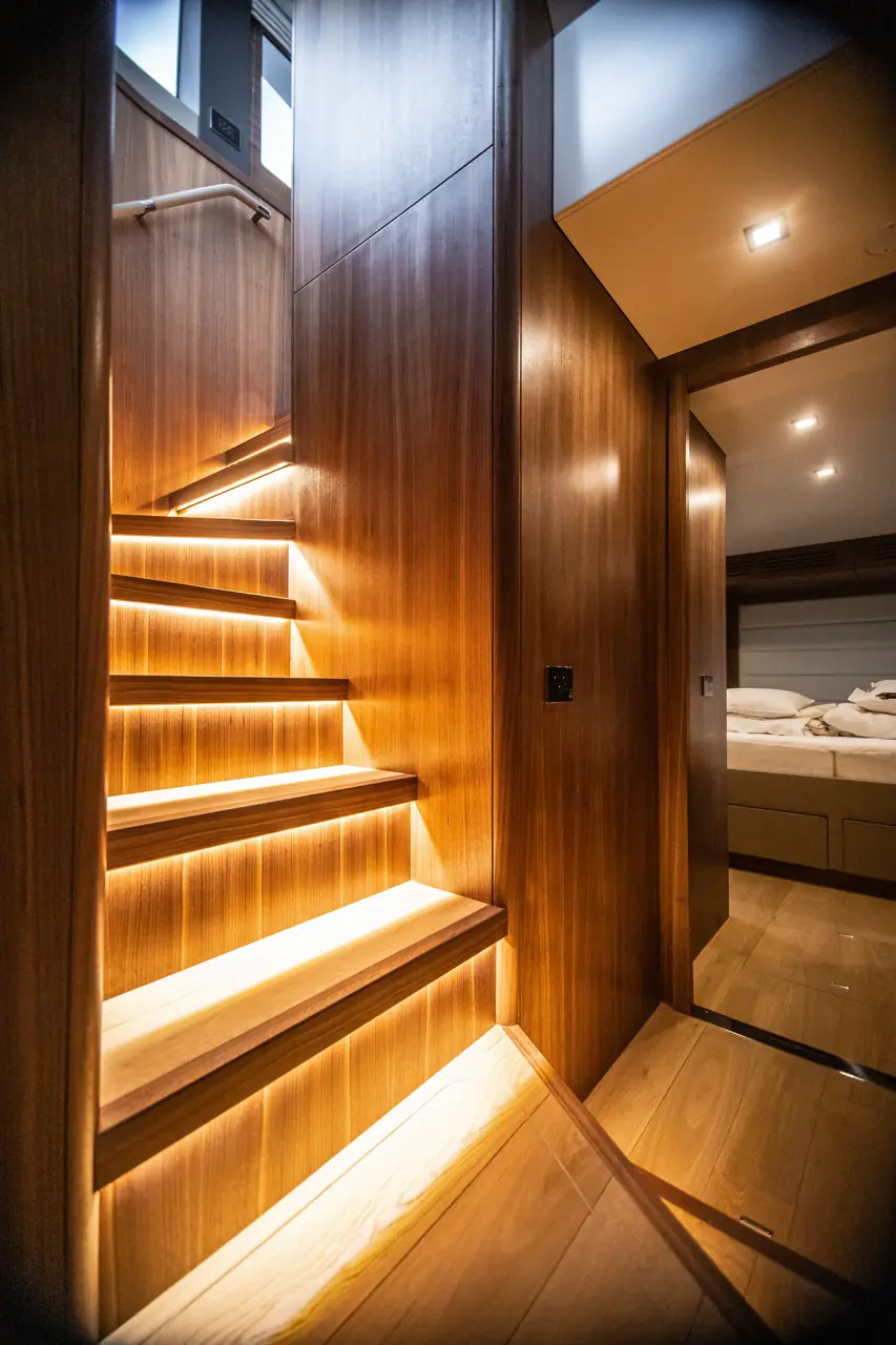 Under dekk kommer båten med tre layouter. Vår testbåt har en stor eierlugar midtskips med bad, en kabin med to senger og toalett, samt en lugar forut med dobbeltseng og eget bad. Du kan også få båten med to lugarer og masterkabin forut med egen utgang til fordekk. Badene har ekte marmor på dørken som opsjon og oppleves som overraskende romslige med både takdusj og godt med lagringsplass.