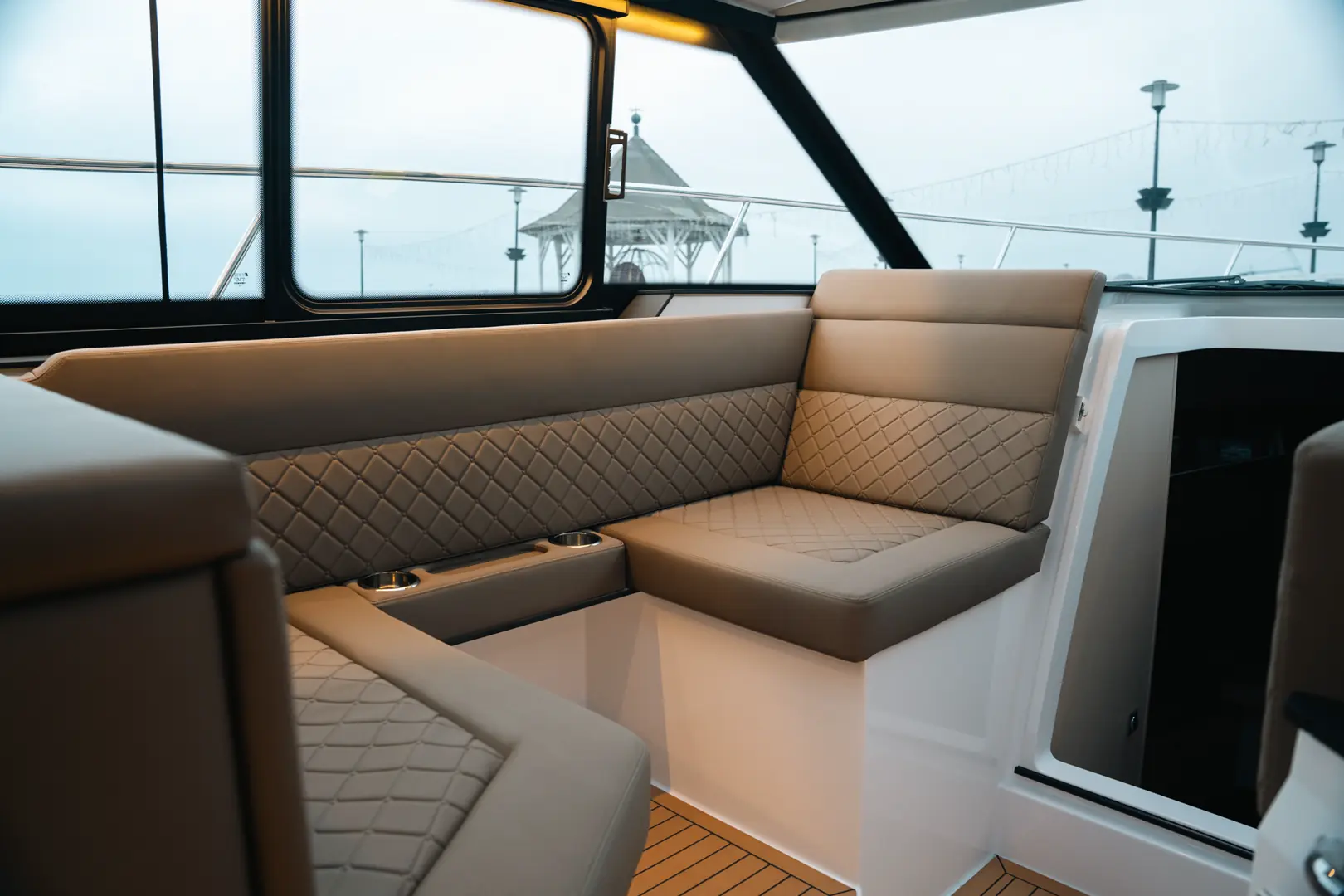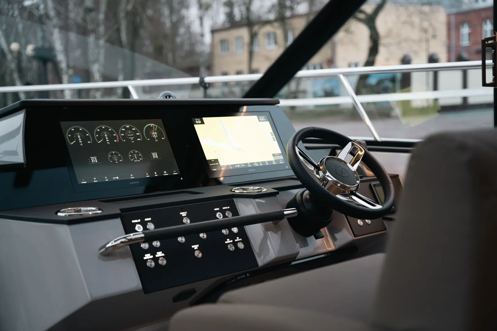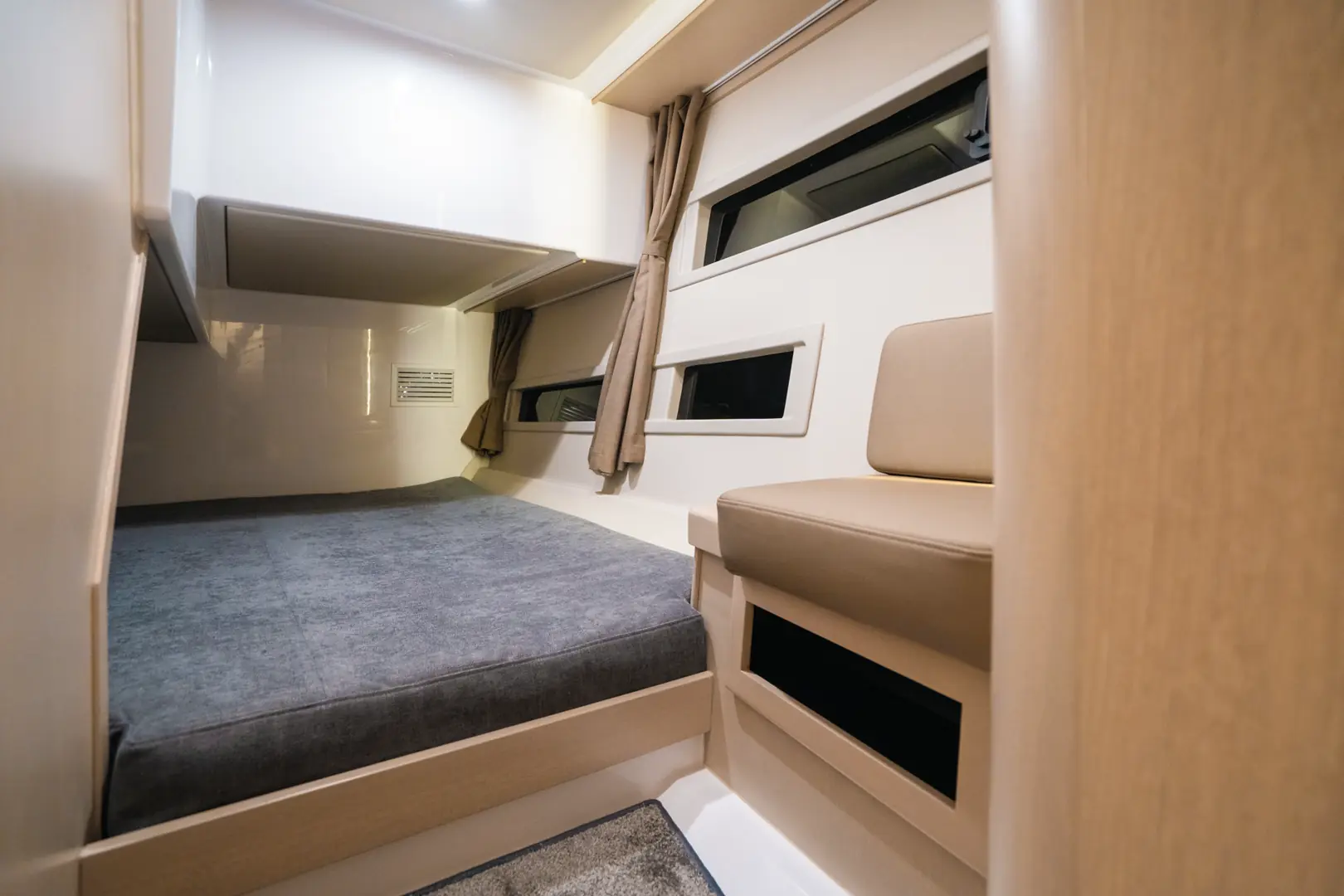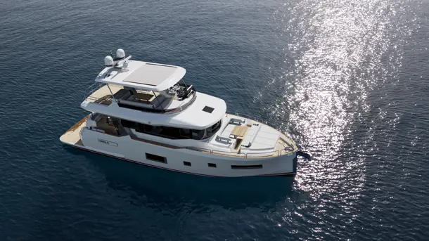 Førerposisjonen kommer med to 12- eller 16-tommers kartplottere, to separate stoler – og en co-førergruppe på babord, som også kan gjøres om til en sjeselong. I hard-topen får du også takluke, og det skal være mulig å stå og kjøre båten. Siden taket strekker seg nesten helt bak får du også to takluker ved salongen akter.