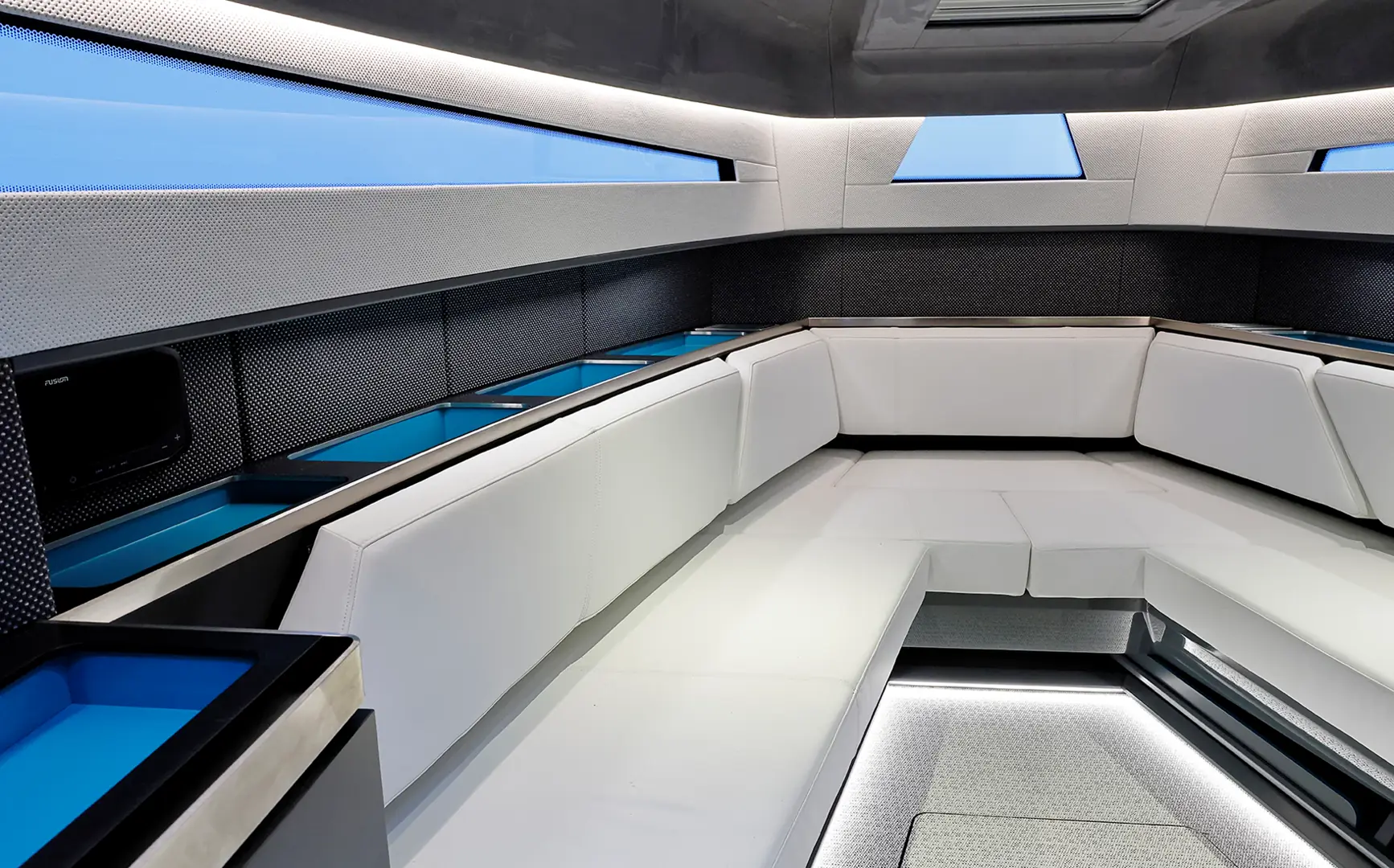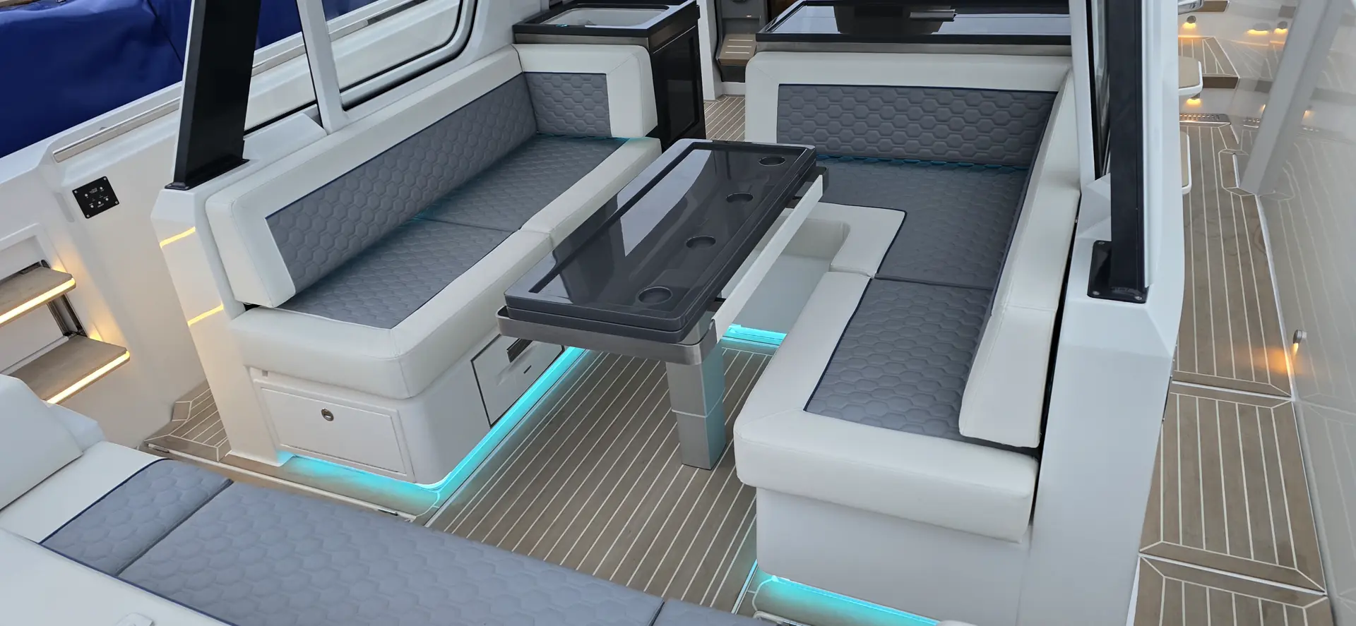 Under dekk kommer 40-foteren med enten en U-formet sofa eller en fast seng for to personer, samt skap- og oppbevaringsplass. Det separate toalettrommet er utstyrt med dusj.
