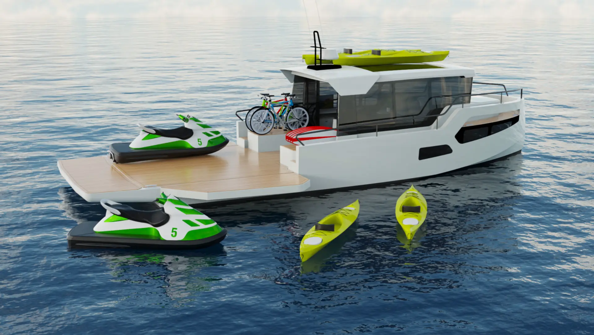 Båten er 40 fot, men rommer så mye. Det er plass til 2 par vannskotere, 2 kajakker akter, og inne er det 2 doble kabiner, med full pantry, osv