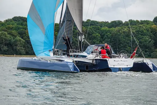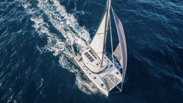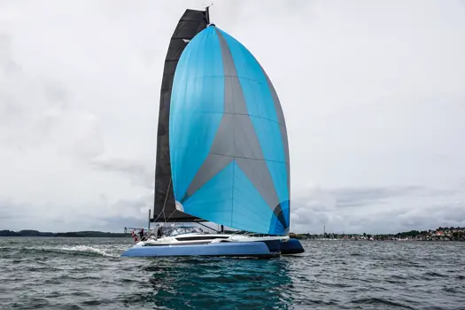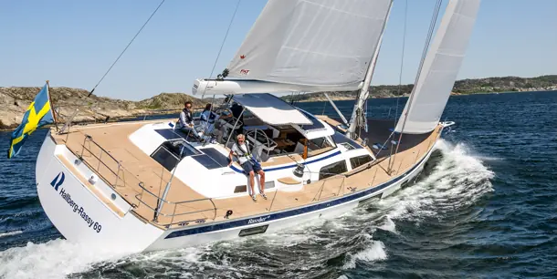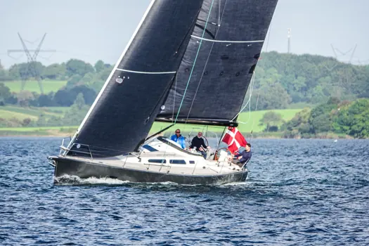 Testbåten var utstyrt med enkle dacron-seil og alu-rig, selvslående forseil og storseil med lazyjacks. Under vår test blåste det mellom 6 og 7 knop true wind. – På kryss var farten snaut 1,5 knop under vindhastigheten, og det var ingenting å utsette på balanse og krengning. Det var to vinsjer på hyttetaket hvorav den ene elektrisk. Altså enkel storseilheising og reving. Vinsjene kunne brukes av alle trimliner, men de sto litt for nærme taulåsene som skapte mye vinkel. Storseilet hadde tyskerhal og løygang. Kapelltaket hadde store vinduer og vi gjennomførte testseilasen fint med dette taket på. Båten hadde liten ror-respons og var litt «slarkete» på kryss, men igjen, dette er en turbåt, forteller Hans Kristian om seilegenskapene.