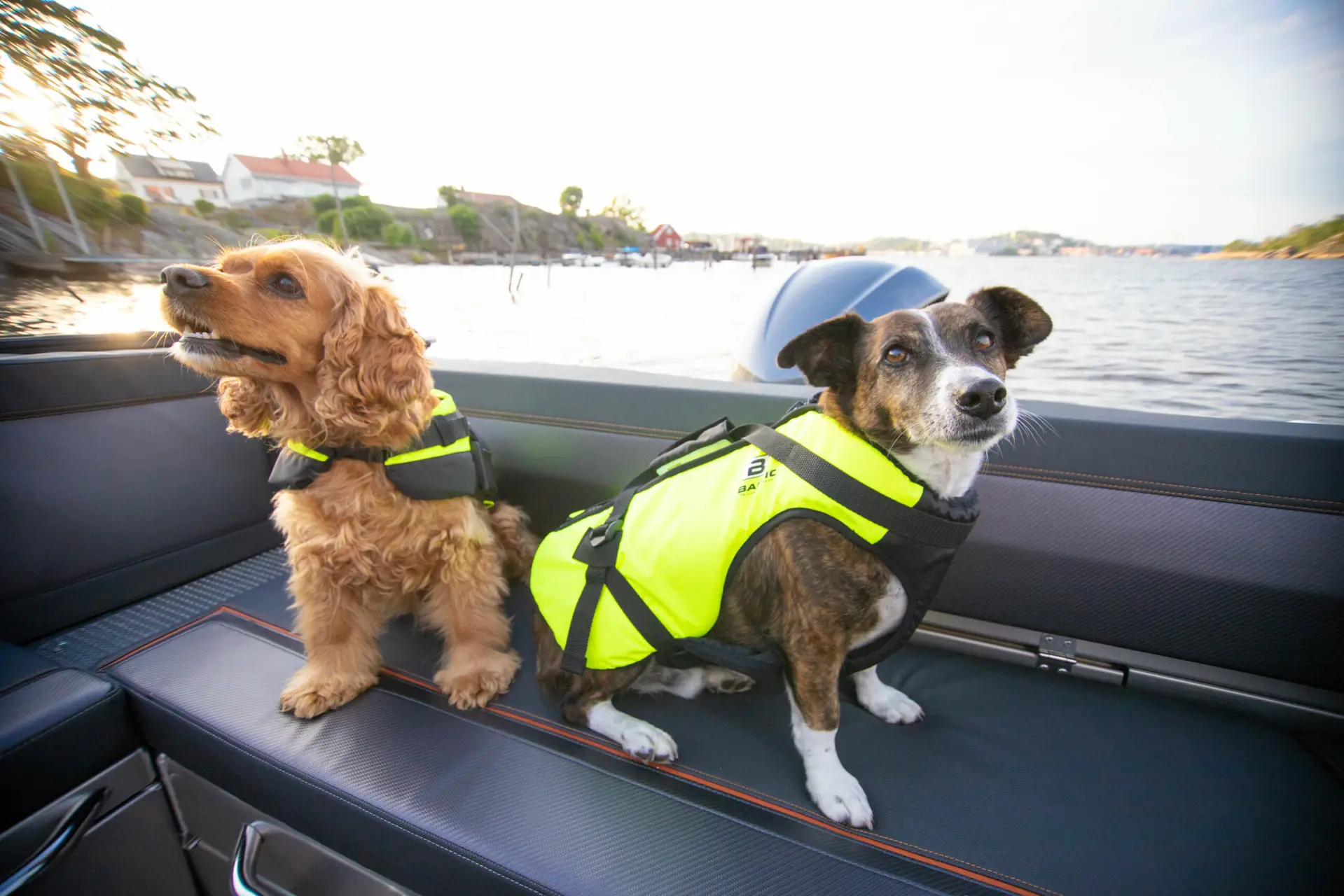 Med på båttur i Buster Magnum har vi hundene Albert og Stella sammen med Sanne Sofie Hansen. Hun tar ofte hundene med på båttur og har vurdert vestene.