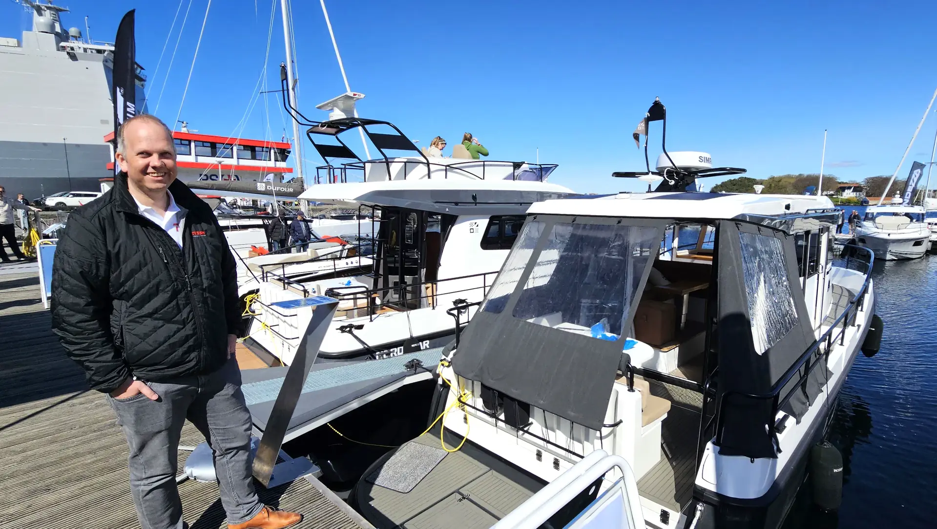 Hos Nordic Boats møtte vi Albrecht Schøll, de stilte med 3 båter fra Marex. Han er en ivrig forkjemper for båtmesse, og mener det er veldig viktig å vise seg frem med de flotte merkene de representerer.