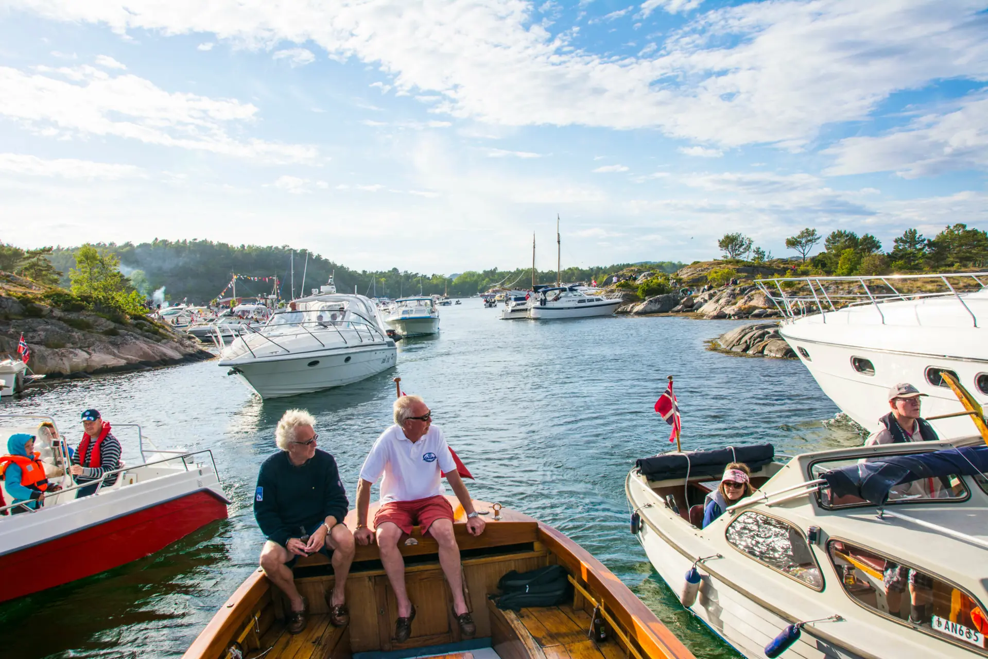 Største båt var skonnerten Solrik på 67 fot, og mellom «vanlige» båter var det innslag av pyntede trebåter, men også plastbåter som hadde fått pyntegjenstander, bjørkeris og blomster på dekk. Det er til tider trangt med så mange båter på et lite sted, men i høflighetens navn og båtfolkets ånd, er det bare en arm eller et bein som skal til for å forhindre «kollisjon» og sammenstøtninger. Stemningen her er til å ta og føle på.