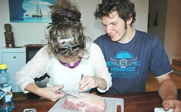 En ettermiddag i august var det sykurs som stod på agendaen. Vi får virkelig håpe at vi ikke får bruk for disse ferdighetene i løpet av turen, men det er selvsagt viktig å kunne teknikken. Spesielt siden et alvorlig kutt må syes eller stripses innen fire timer og infeksjonsfaren om bord er stor. Med suturer, pinsett og nåleholder gikk vi løs på skinkesteika og ble ganske så fornøyd med resultatet.