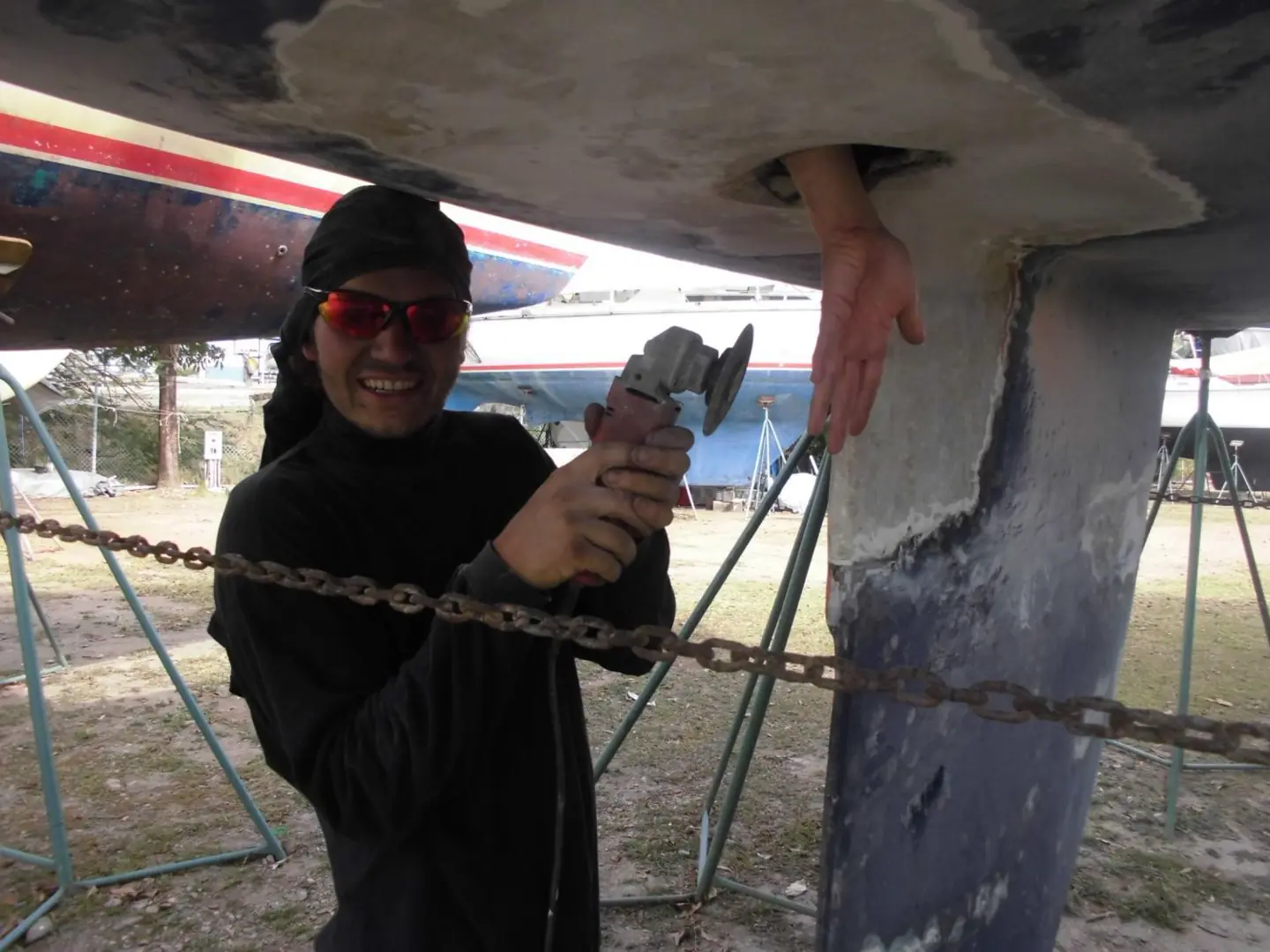Mens vi byttet wirene satte vi “Amanda” på land. Det var på tide med nytt bunnstoff og jeg hadde i tillegg lyst til å sjekke rorlageret, som lagde mistenkelige lyder og virket som om det hadde litt for mye spill. På land oppdaget vi en liten sprekk bak kjølen der det piplet ut vann. Da vi begynte å pusse rundt sprekken viste det seg at båten hadde en omfattende gammel skade fra en tidligere grunnstøting.