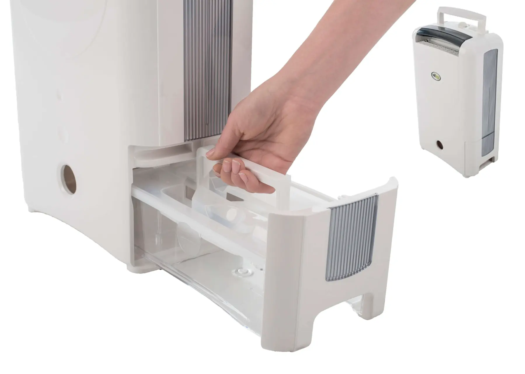 De flyttbare avfukterne fungerer slik at kondensvannet samles i en tank i bunnen av apparatet. Denne kan romme 2-5 liter. Uansett størrelse vil den raskt bli fylt opp, og da kobler avfukteren ut inntil noen har tømt tanken. For de fleste avfuktere kan det kobles til en dreneringsslange, slik at kondensvannet i stedet kan føres ut gjennom denne og til vask, eller i annet avløp. Ulempen med bruk av dreneringsslange er at avfukteren må stå høyere enn avløpet – vannet må renne ut og ned. Bruker man for eksempel vasken i byssen som avløp, settes gjerne avfukteren på benken. Da må den sikres med stropper for at den ikke skal falle i dørken, og den står hele tiden i veien.