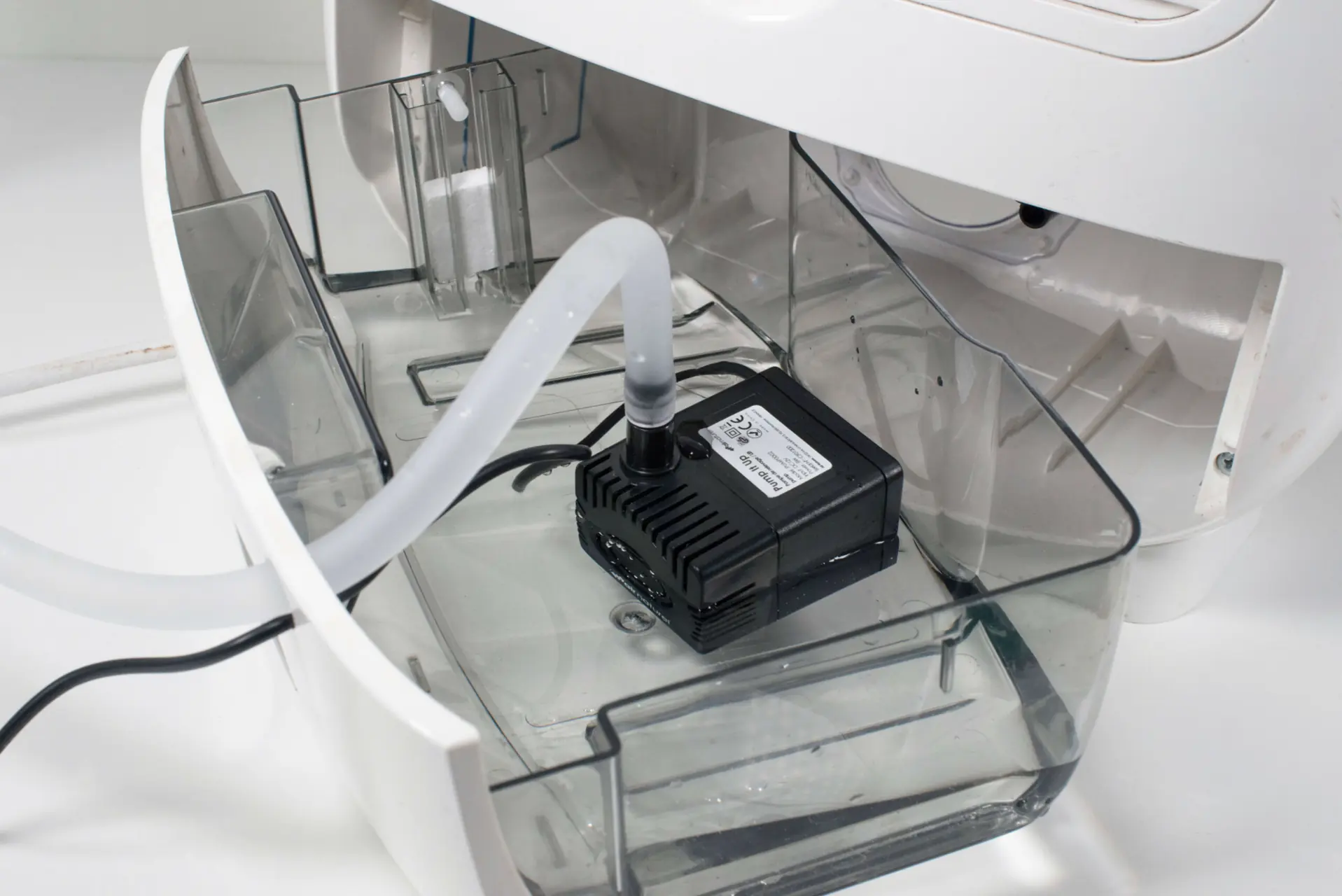 AirNaturel Pump It Up er en liten pumpe som festes i avfukterens kondenstank. Avløpsslangen føres gjennom hullet som er i skuffen (for tilkobling av dreneringsslange) og festes til pumpen. Gjennom samme hull trekkes strømtilførselen – som igjen kobles til medfølgende strømadapter for 230 volt. Avløpslangen kan føres ned i avløp (vask, dusj, toalett) eller ut i friluft. Når kondenstanken fylles opp, starter pumpen automatisk og kan løfte vannet opp til tre meter høyde. Den stopper automatisk når nivået i kondenstanken synker. Med dette systemet kan man for eksempel ha avfukteren stående på dørken i stedet for oppe i høyden. Pris kr 349, - hos Seatronic.