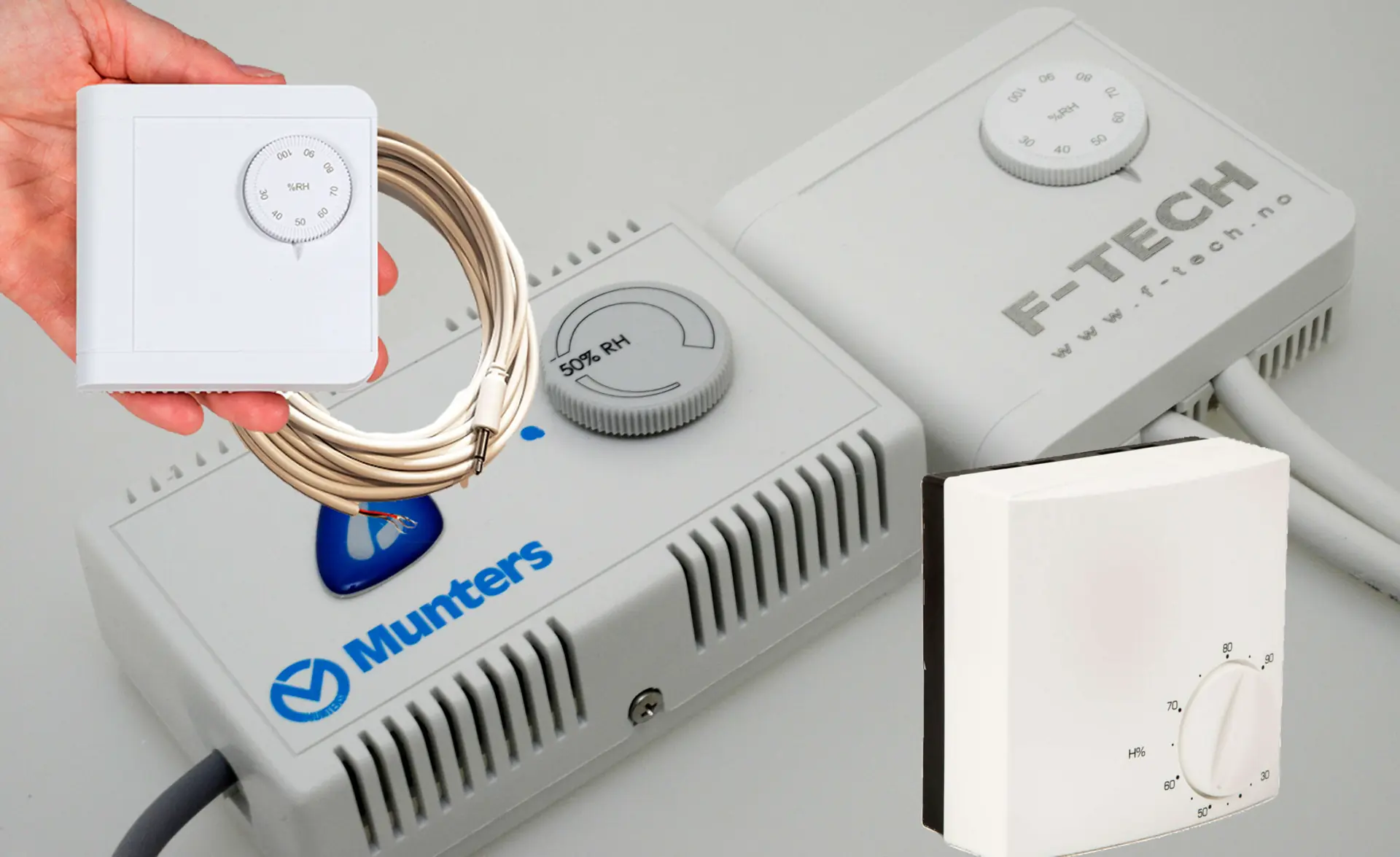 HYGROSTAT: Vi kan si hygrostat er en termostat for luftfuktighet. Når avfukteren kommer ned på innstilt verdi kobler den ut. De mer avanserte modellene for fast montering har muligheter for ekstern hygrostat som plasseres et egnet sted – på samme måte som en termostat hjemme.