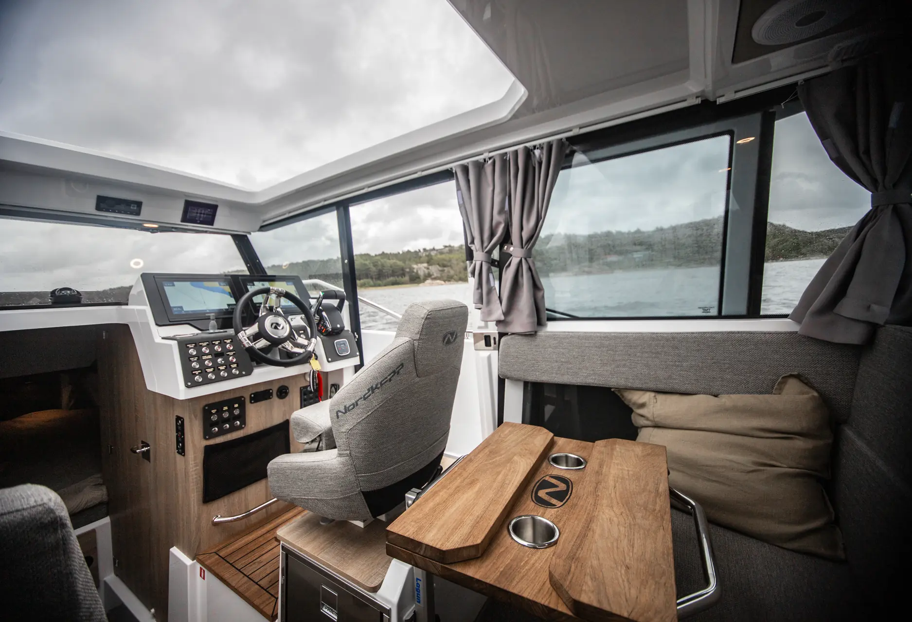 Om bord i vår testbåt finnes et standard kjøresete med sitte- og ståstilling, men om vi skulle benyttet båten til langturer ville vi vurdert en oppgradering til et sete med demping. Utover det er førermiljøet upåklagelig med mulighet for to Garmin-plottere på hver 12 tommer i riktig synsvinkel, ergonomisk plassert gir/gass og justerbart ratt. Sammen med strømbrytere i ryddig oppsett, rødt nattlys og dempede farger på selve dashbordet må vi kunne si at dette er blitt en påkostet førerposisjon, spesielt i denne klassen å være. Et pluss er også at den har to separate stoler i fartsretning, og ved co-førerposisjonen er det trådløs ladning for mobil.