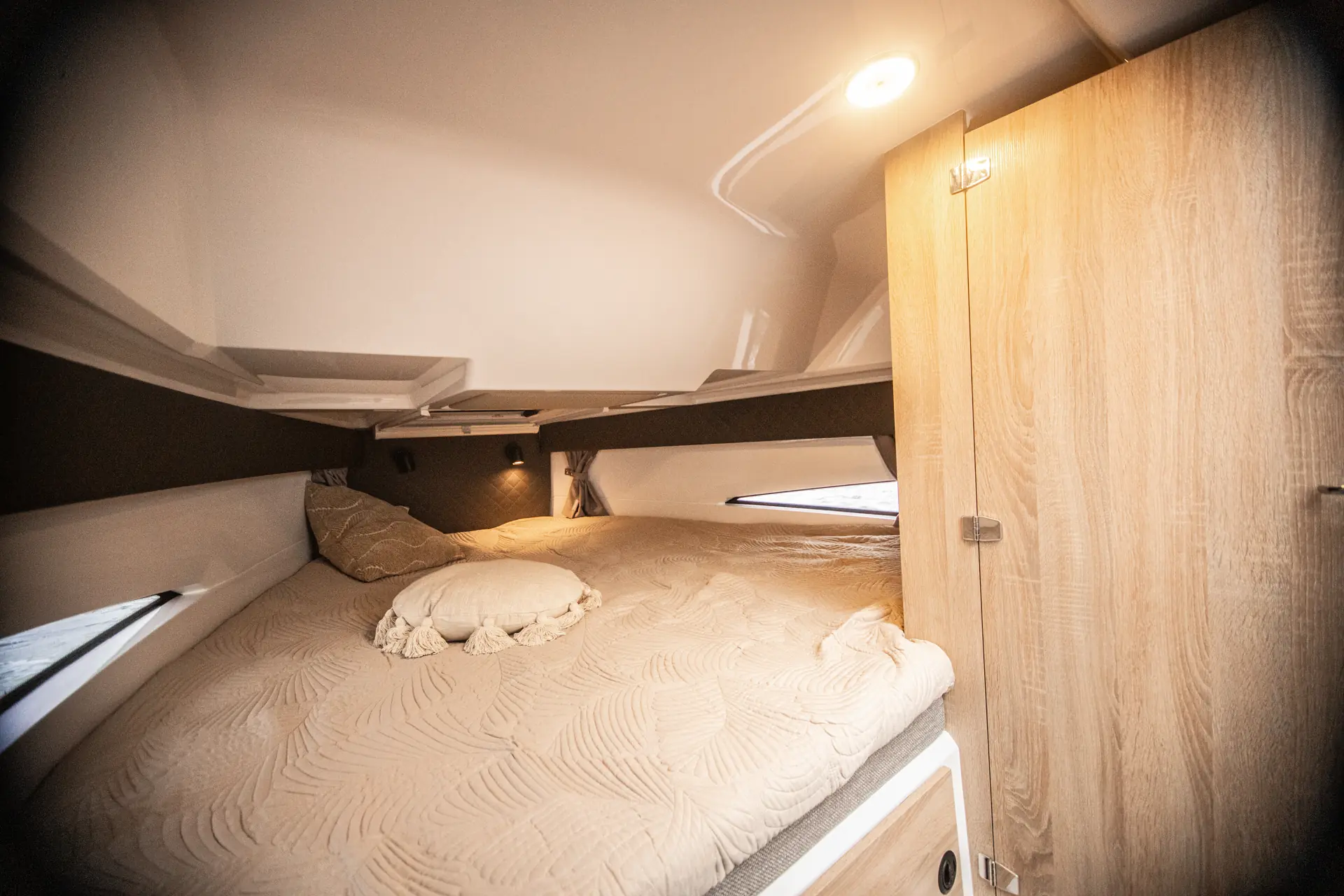 Coupe 830 er i likhet med sine søsken designet av Nordkapps «husdesigner» Espen Thorup. Da dukker det som regel opp noen s-i-ermet som bidrar til å gjøre båtlivet mer komfortabelt. I denne nye båten finner vi et eksempel i baugluken, som er dyp for fendere og tauverk. Her kommer båten med et nett som både tørker tauene, samt gjør de enklere å få tak i uten å måtte legge seg på alle fire.